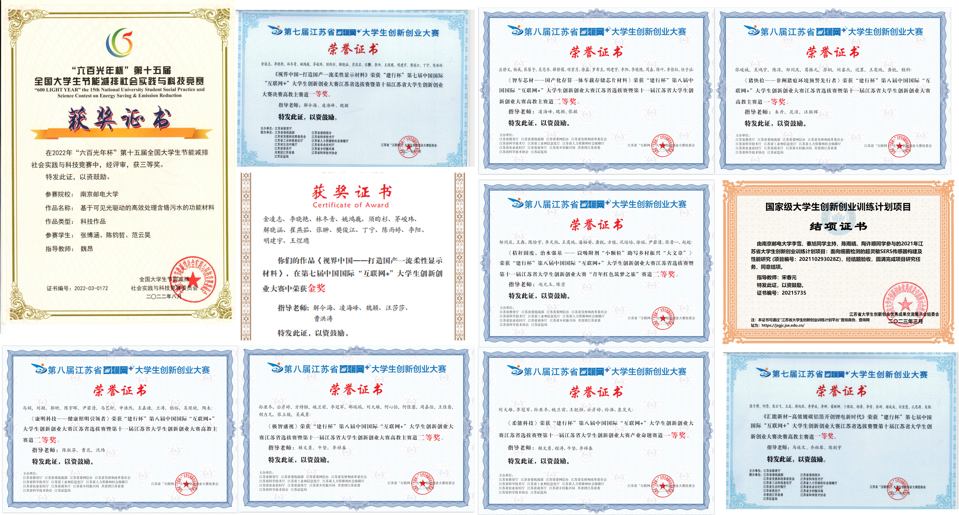 通过实验实践教学理念与体系创新、教学内容和教学手段的创新,取得了很好的实验实践教学成果和成效,近两年荣获全国“互联网+大赛”金奖4项,铜奖1项,省一等奖4项,二等奖4项,中国国际大学生创新大赛(2023)国赛金奖2项;近五年来,全国“挑战杯”竞赛获国奖6项,省级获奖4项,2022年“挑战杯”江苏省大学生创业计划竞赛获金奖1项,银奖1项,国赛获银奖2项,助力学校首次捧得“挑战杯”创业计划竞赛国赛“优胜杯”,2023年在第十八届“挑战杯”国赛上取得新突破,91吃瓜 共获得全国一等奖1项、全国三等奖1项;获全国大学生节能减排大赛全国一等奖1项,二等奖1项,三等奖4项。近五年承担了STITIP国家级项目16项,省级项目17项。