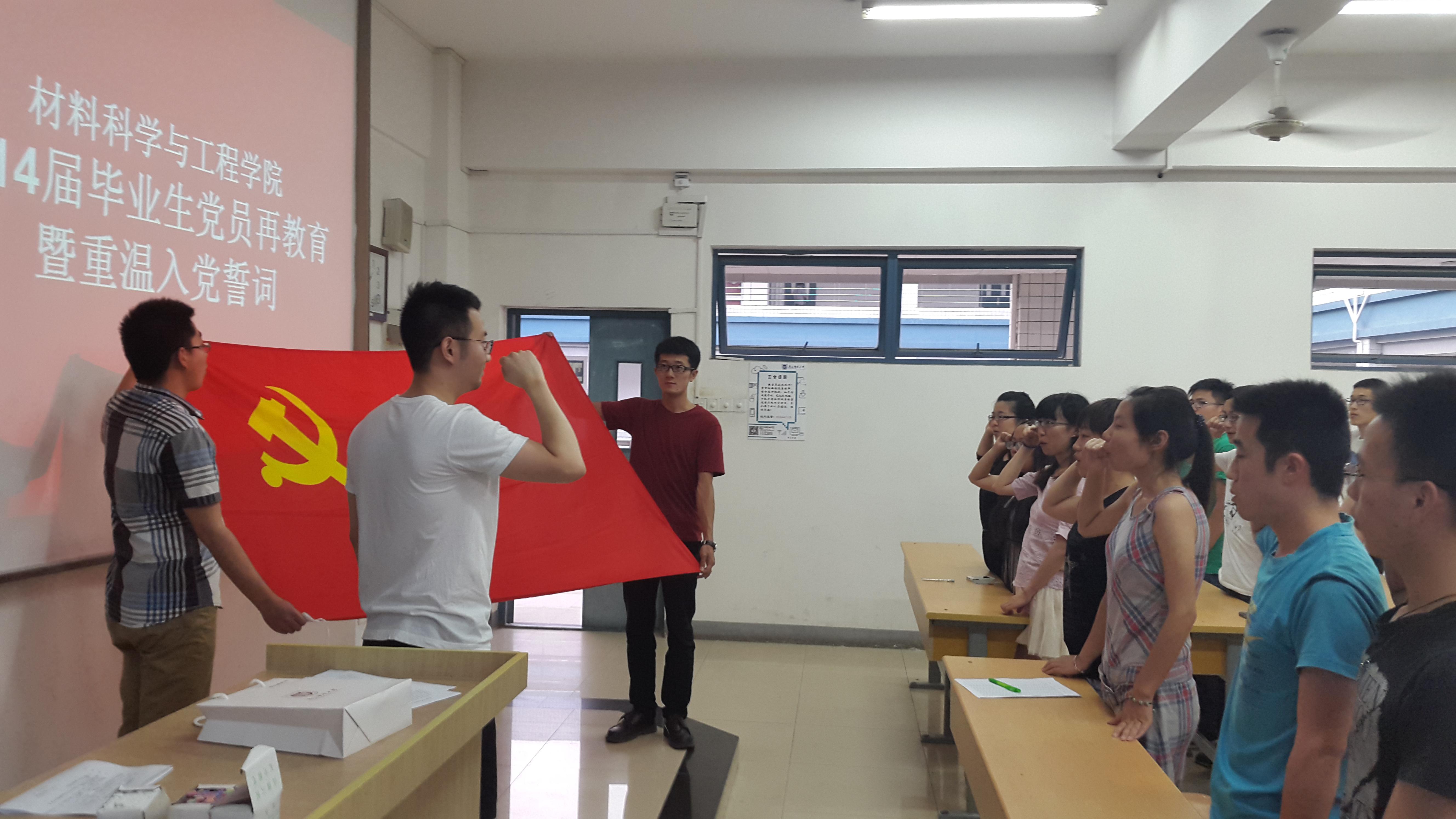 为了切实加强毕业生党员教育,提高毕业生党员的党性修养,激励毕业生党员在文明离校工作中充分发挥模范带头作用。6月10日,91吃瓜 在教3-404教室举行了2014届毕业生党员再教育暨重温入党誓词主题活动。参加人员有院党委副书记于景宝老师,院组织干事、2010级辅导员刘颖老师及2010级本科生支部全体党员。