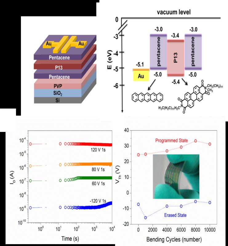 91吃瓜 IAM团队的仪明东教授和解令海教授共同报道了一种以三层有机半导体异质结(Pentacene/P13/Pentacene)作为半导体层的有机场效应晶体管存储器,利用Pentacene/P13/Pentacene形成的类量子阱结构,成功实现了对电荷的存储,同时与聚合物栅绝缘层固有的电荷存储性质协同作用,使得存储性能得到显著提高。该存储器具有稳定存储耐受性(读写擦循环次数超过3000次)和超长的存储寿命(10年以上),并实现了存储态分明的4阶存储特性(即2比特信息存储)。此外,该三层有机半导体异质结结构可以与柔性衬底相兼容,进而成功制备了柔性非易失性晶体管存储器,其在弯曲半径为10 mm的条件下反复弯曲10000次后仍能保持较好的存储性能。