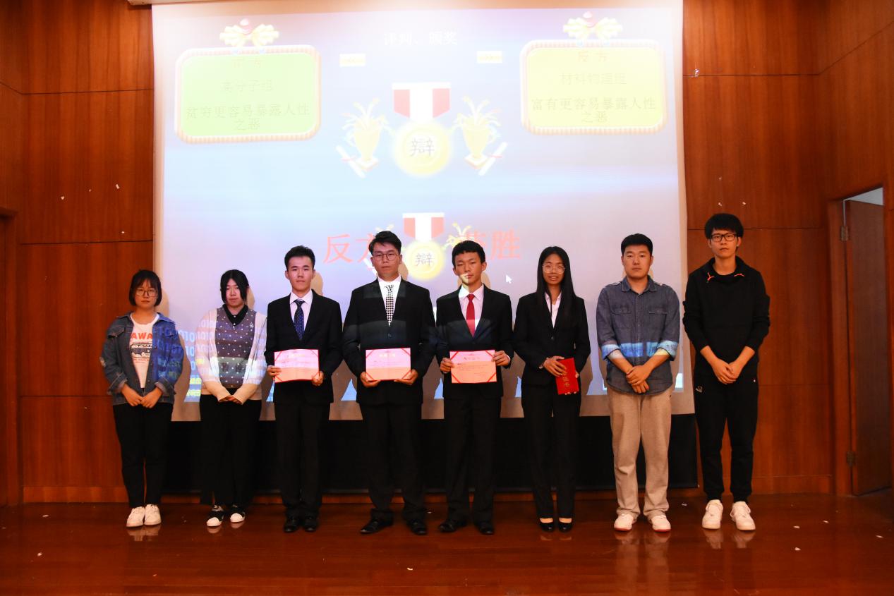 最终,经过评委们公正的评判,材料物理专业以更加出色的发挥略胜一筹,获得了本次新生赛的胜利,来自高分子专业的傅彦翔同学摘得“最佳辩手”的称号。