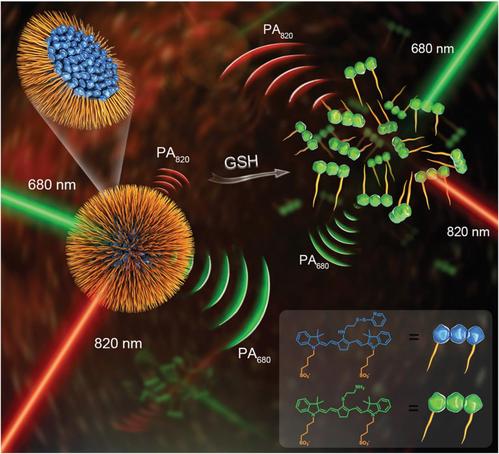 相比于传统的成像模式,新近发展起来的光声成像技术有效克服了以上问题。光声成像的原理是基于光学激发和声学检测,因而具有很强的组织穿透能力,实现真正意义上的深层组织高分辨率成像。虽然目前已有一些激活型光声探针在成像和传感中的应用,但其检测的靶标分子局限于一些氧化性物质,如次氯酸和过氧亚硝酸根等,而针对还原性分子如谷胱甘肽,相应的激活型探针还很少报道。这主要是因为对于还原性刺激而产生近红外吸收改变的探针在结构的设计上具有很大挑战。