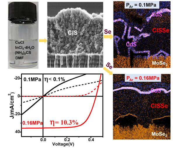 信息材料与纳米技术研究院辛颢课题组以DMF为溶剂制备了可在室温下长期稳定存放的前驱体溶液,并由该溶液经旋涂、退火、硒化制备铜铟硒(CIS)吸光层材料和太阳能电池器件。他们发现,在常规(1大气压)条件下进行硒化反应得到的吸光层薄膜晶粒松散、膜层中存在纵向贯穿的空隙,导致化学浴沉积的CdS缓冲层渗透并贯穿了吸光层,造成器件短路,光电转换效率小于0.1%。通过增加硒化反应的气氛压力(1.6大气压),抑制了铟元素的丢失,得到贫铜的多晶薄膜,晶粒排布致密,CdS层在薄膜表面分布平整,电池光电转换效率提高到10.3%。而且,加压条件下制备的CIS膜不需要KCN、(NH4)2S等溶液的刻蚀来除掉表面杂相,简化了工艺,降低了对环境的影响。