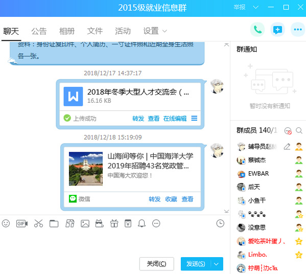 毕业生辅导员赵赫男对学生进行全面的就业意向摸底工作,建立动态数据库,定时更新学生就业数据。线上依托“2015级就业信息”QQ群,实施发布并解读就业信息,累计发布就业信息300余条。线下通过谈心谈话,摸底调查,让学生树立良好的就业心态,明确职业认知,做好职业定位。