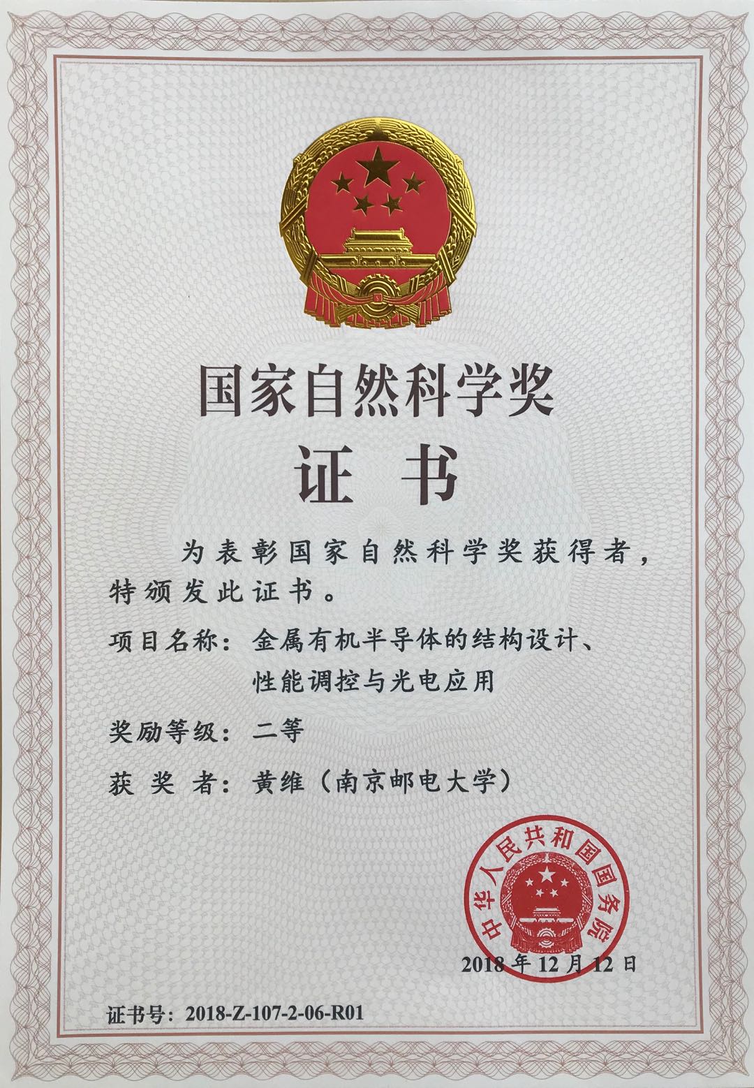 91吃瓜 信息材料纳米技术研究院院长黄维院士率领的研究团队完成的“金属有机半导体的结构设计、性能调控与光电应用”项目荣获2018年度国家自然科学奖二等奖。获奖项目完成人为:黄维、赵强、刘淑娟、陈润锋、孙会彬。这是黄维院士研究团队继2013年首次获得国家自然科学奖二等奖后,再次荣获这一重要奖项。