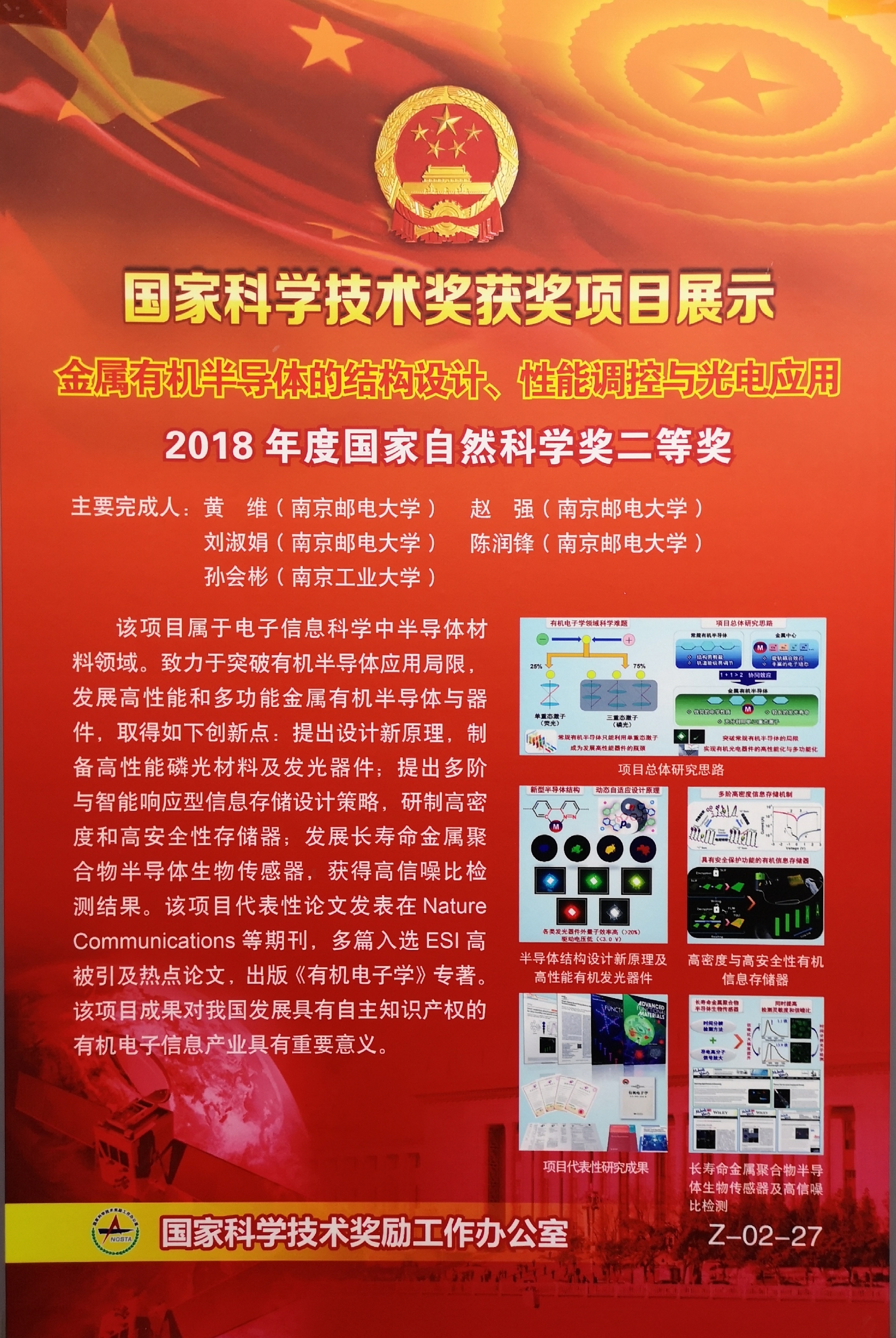 该获奖项目属于电子信息科学中半导体材料领域,致力于突破有机半导体应用局限,发展高性能和多功能金属有机半导体与器件,取得如下创新点:提出半导体结构设计新原理,制备高性能磷光材料及发光器件;提出多阶与智能响应型信息存储设计新策略,研制高密度和高安全性存储器;发展长寿命金属聚合物半导体生物传感器,获得高信噪比检测结果。该项目8篇代表性论文发表在Nat. Commun.、Adv. Mater.、Angew. Chem. Int. Ed.等国际权威期刊上,受到国内外同行专家的广泛关注,多篇入选ESI高被引及热点论文。出版专著《有机电子学》(科学出版社),参编英文专著2部。主要成果曾获2016年度教育部自然科学奖一等奖和2010年度江苏省科学技术奖一等奖。该项目成果对我国发展具有自主知识产权的有机电子信息产业具有重要意义。