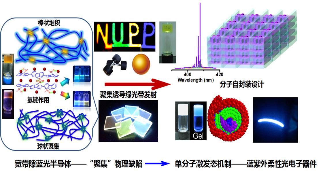 基于前期光电高分子凝聚态结构研究的基础上,IAM团队黄维院士和林进义副教授研究小组,进一步通过超分子功能化方法,对比研究氢键功能化前后分子链自组装特性,有效论证了分子链聚集过程是诱导聚芴绿光带发射的重要原因,分子水平上指出固态薄膜下聚芴绿光带存在不同的聚集诱导机制:单链扭曲构象和多链激基缔合物形成(Journal of Materials Chemistry C2018, 6, 1535-1542. Journal of Materials Chemistry C, 2018, DOI: 10.1039/C8TC02975J.)。在此基础上,借助位阻功能化,引入多维度的纳米位阻基团,通过空间位阻作用抑制分子链间聚集作用,在纳米和薄膜状态下成功抑制绿光带发射,从侧面佐证了链聚集可直接诱导产生聚芴绿光带(500-600 nm)的产生(Journal of Materials Chemistry C, 2018, 6, 7018-7023.)。因此,如何有效抑制固态薄膜下“链聚集”诱导产生的物理缺陷发光,成为构筑高效稳定的宽带隙蓝光发光体系及其光电子器件,成为目前研究该领域的研究重点。