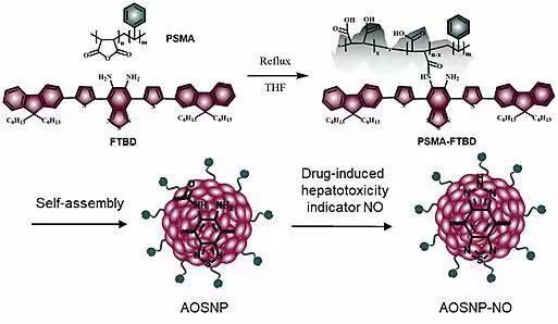 AOSNP包含一个一氧化氮敏感的有机半导体基团(FTBD)作为主要的传感组件,在一氧化氮的存在下,可以将其能量受体单元转换成更强的受体(图1),从而有效地将其荧光从NIR-I区红移到NIR-II区(图2)。