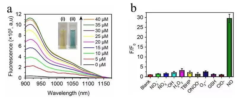 图2.(a)探针荧光光谱随着一氧化氮浓度变化;(b)探针对一氧化氮的选择性