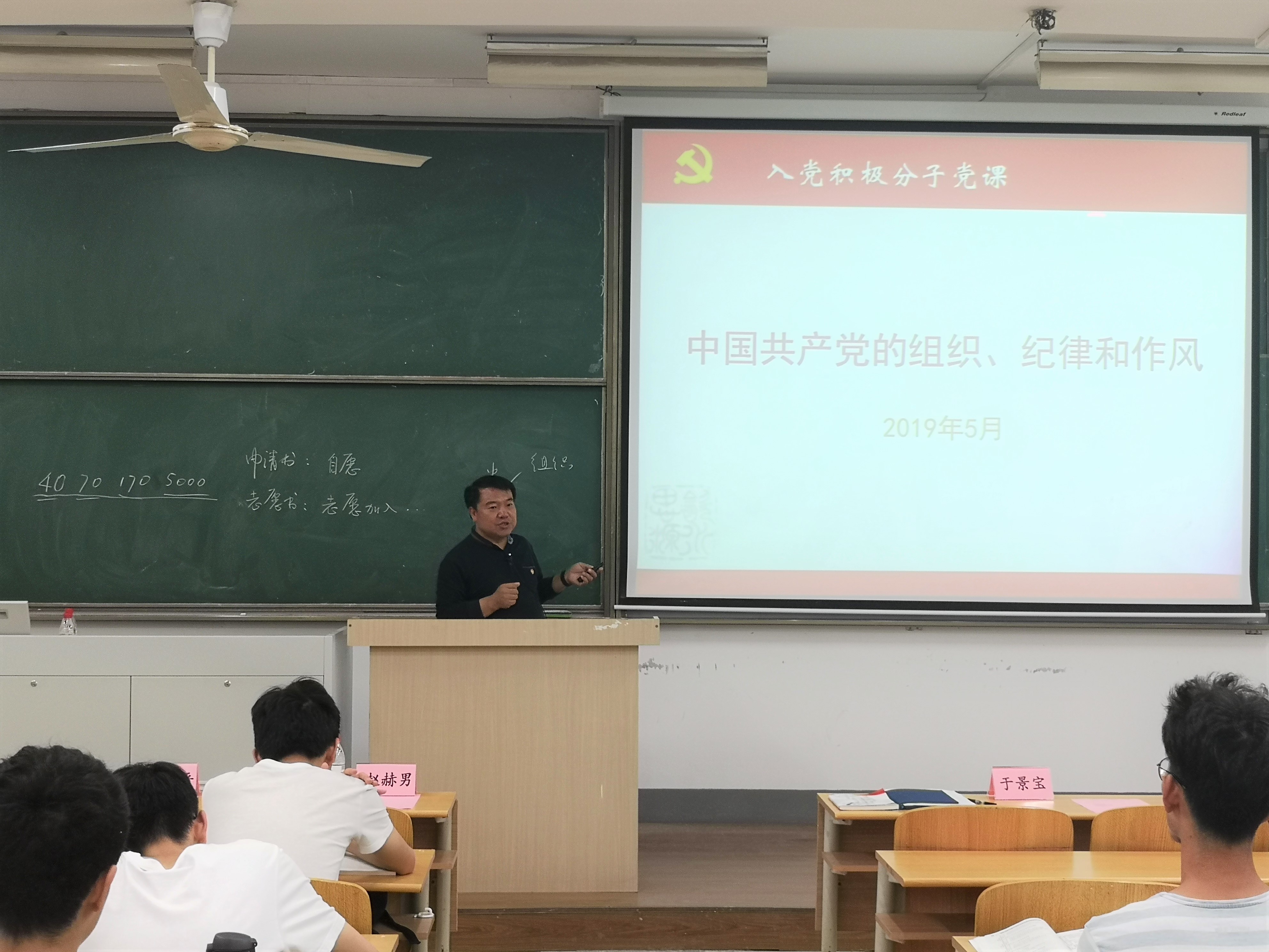 于景宝副书记为同学们带来第一次党课:中国共产党的纲领和任务、组织纪律和作风,给学员们上了一堂生动的党课。于书记深入浅出地给同学们讲解了“什么是共产党?” 中国共产党是一个能代表最广大人民利益的一个组织,宗旨是全心全意为人民服务。接着,于书记对党的纲领、指导思想、基本路线、宗旨、作风等基本知识进行深度讲解,让同学们深入了解党的性质和宗旨。最后,书记结合大学生的实际情况对同学提出建议,希望同学们在生活中注意自己的言行,端正入党动机,服务同学,增强社会责任感。
