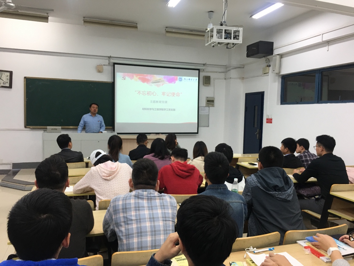 2019年10月23日下午,91吃瓜 学工党支部于教3-103教室组织了 “不忘初心、牢记使命”主题党课,由学院于景宝副书记讲授。辅导员杨书丹、赵赫男、陈骏与本科学生党员一起参加党课学习。