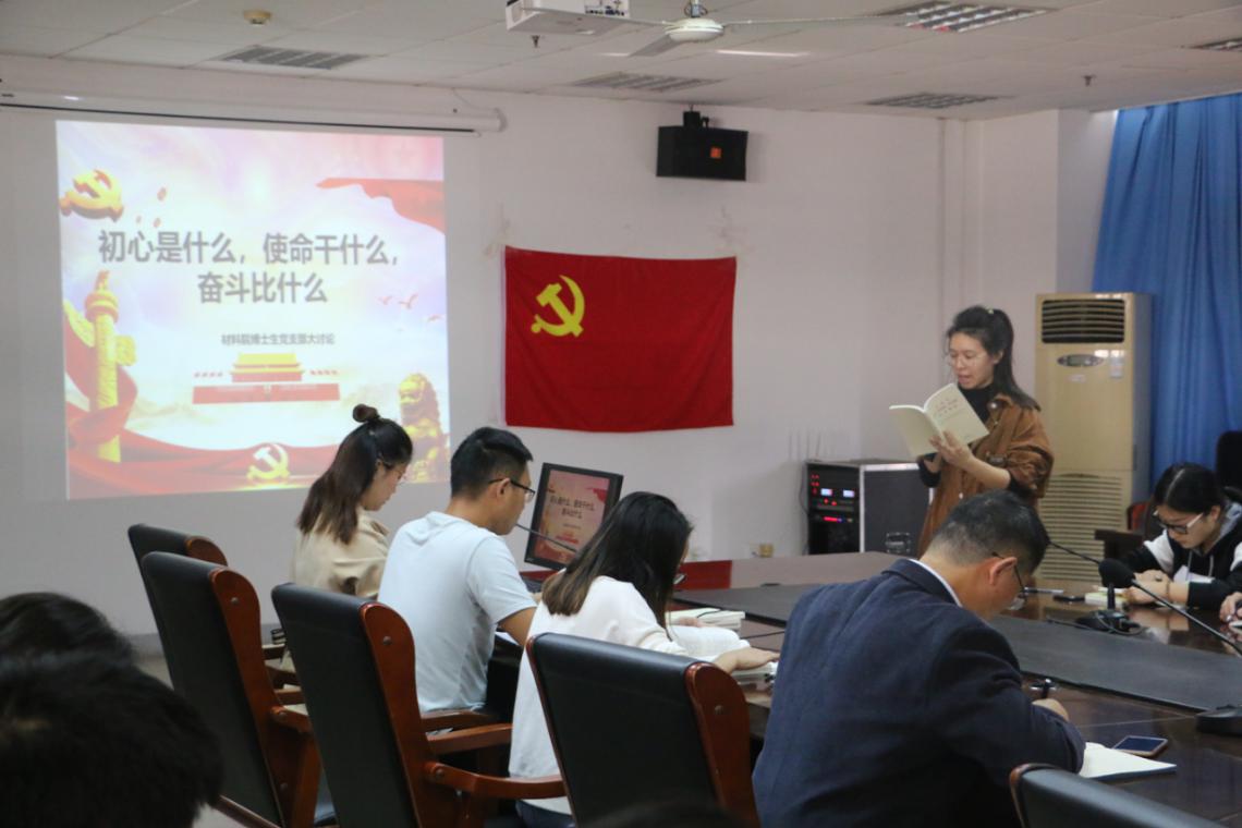 10月24日,材料学院博士生党支部开展“初心是什么、使命干什么、奋斗比什么”大讨论活动,活动学习了《习近平关于“不忘初心、牢记使命”重要论述摘编》、《习近平新时代中国特色社会主义思想学习纲要》、《初心永恒-江苏四种革命精神简明读本》。材料学院副院长陈润锋和支部全体党员参加了此次活动。