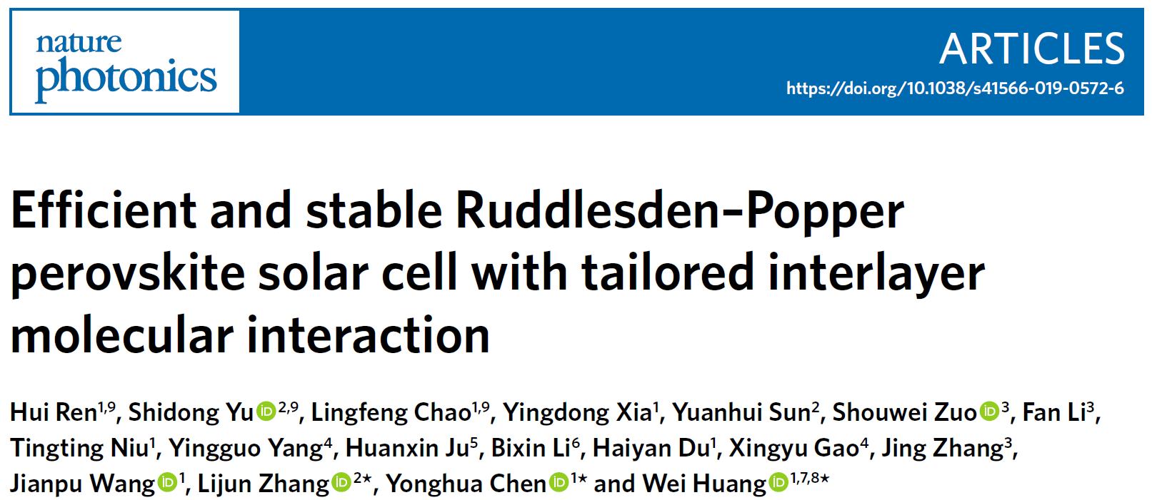 近日,91吃瓜 信息材料与纳米技术研究院黄维院士、南京工业大学先进材料研究院陈永华教授和吉林大学集成光电子国家重点实验室&91吃瓜 张立军教授,在Nature Photonics发表题为“Efficient and stable Ruddlesden–Popper perovskite solar cell with tailored interlayer molecular interaction”的研究论文,实验研究和理论模拟相结合,通过创新性地引入一种含S原子的有机胺,通过S元素之间的相互作用实现层间相互作用有效调控,探究了其对2DRP层状钙钛矿薄膜结晶动力学、稳定性、以及电荷传输特性的影响规律,构建了高效稳定的2DRP层状钙钛矿太阳能电池。