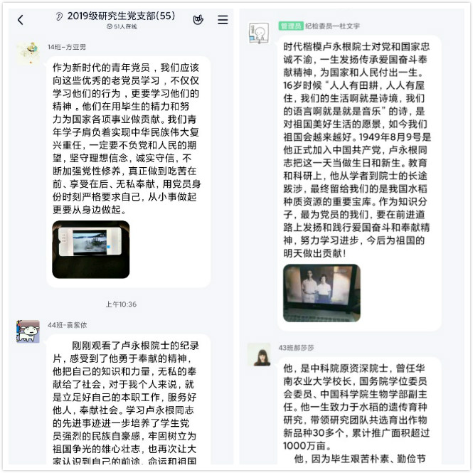 学生各支部也进行了学习,学生党员认为,作为新时代的青年学生,作为一名共产党员,应当学习卢院士流淌在血液中的爱国情怀,学习他艰苦朴素的生活作风,学习他教书育人的满腔激情,更要学习他为社会为国家做贡献而不求任何回报的高尚精神。将卢永根同志的精神转化为党员的内在动力,用自己的实际行动为这场战“疫”贡献自己一份力所能及的力量,切实践行为人民服务的宗旨。