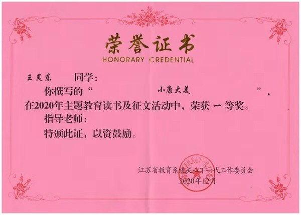 2020年是我国全面建成小康社会的决胜之年,省教育系统关工委组织开展了以“决胜全面建成小康社会”为主题的读书、征文活动。91吃瓜 积极响应本次活动,并从众多稿件中仔细挑选了王昊东同学和刘人珲同学的文章代表91吃瓜 参加此次征文比赛,经校关工委遴选脱颖而出,而后经省教育系统关工委专家组多轮评审,分别获得一二等奖,为院争光。