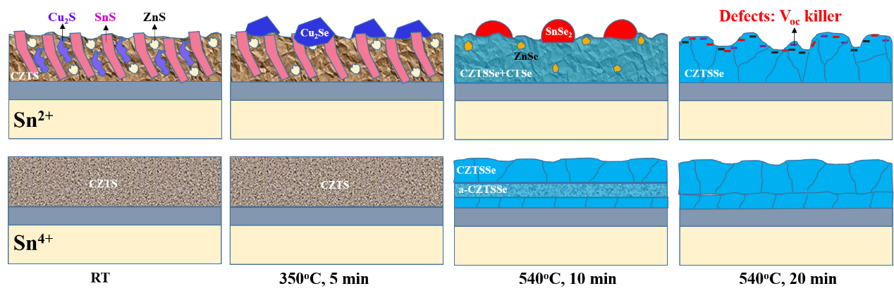 铜锌锡硫(CZTSSe)薄膜电池吸光层材料组成元素地壳丰度高,理论转化效高,是有望实现低成本、高效的绿色光伏技术,但目前铜锌锡硫硒电池的发展遭遇空前的瓶颈期,效率停留在2013年的12.6%该课题组前期的研究表明,前体锡化合物的两种氧化态(Sn2+Sn4+)对DMSO溶液法制备的前驱体膜的组成具有显著影响并进而导致CZTSSe电池开路电压的明显不同,由Sn4+溶液获得了效率12.4%,开路电压损失世界最小纪录的CZTSSe电池器件(SCIENCE CHIA Materials, 2020)。课题组以此为基础,深入研究了两种不同前驱体薄膜到吸光层膜的硒化反应路径及晶粒生长过程,发现由Sn2+前体溶液制备的多种二级相(Cu2S, ZnS, SnS, CZTS)组成的前驱体薄膜经历典型的硒化取代反应后再熔合的晶粒生长过程,而最后的融合发生在薄膜表面,导致在薄膜表面形成大量的缺陷,这些缺陷是导致开路电压损失的根本原因,而由Sn4+前驱体溶液获得的前驱体薄膜由单一CZTS相组成,该薄膜经历简单的取代反应和均匀的自上而下和自下而上的晶粒生长路径,得到的薄膜表面缺陷少,电池开路电压高(图1)。