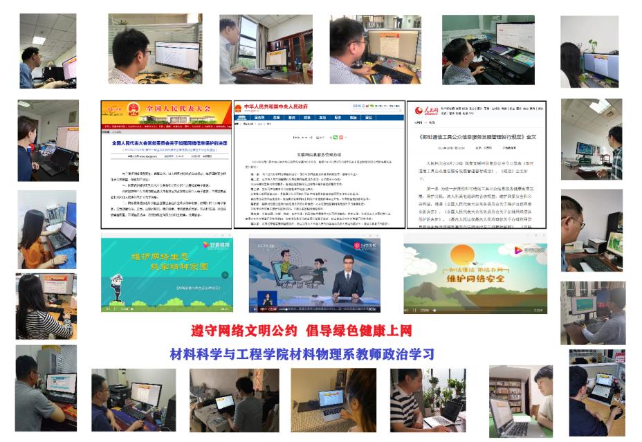 材料物理系党支部组织全系教师开展了主题为“遵守网络文明公约,倡导绿色健康上网”的政治学习,以必学材料学习与自学相结合的形式开展,将文件学习与视频案例学习相融合,分别学习了《全国人民代表大会常务委员会关于加强网络信息保护的决定》、《互联网信息服务管理办法》、《即时通信工具公众信息服务发展管理暂行规定》等文件,以及《维护网络生态,筑牢精神家园》、“发圈”别“出圈”、《知法懂法、依法办网、维护网络安全》等视频资料。通过学习,大家一致认为上网要有节制,有目的、有选择地浏览信息,自觉抵制不良信息,要增强自我保护意识,要维护网络安全,不破坏网络秩序,要增强网络安全意识和法律意识,同时要在教学、科研过程中积极向学生倡导网络文明公约,帮助学生认识网毒危害,形成健康文明、积极向上的上网习惯。