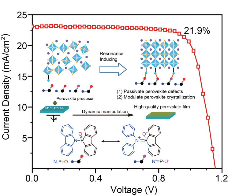 最近,91吃瓜 陈润锋教授、郑州大学段征教授以及阿卜杜拉国王科技大学殷骏博士报道了一种动态调控钙钛矿结晶生长的新策略,具体是设计制备具有动态共振结构的新型空穴传输材料,从钙钛矿底部进行结晶生长调控,该材料能够在中性和带电共振形式的多个电子态之间实现快速自适应的互变异构,诱导钙钛矿晶体生长并进行原位缺陷钝化,并通过共振变化与钙钛矿底部的Pb缺陷作用,形成具有光滑表面、定向结晶和低缺陷态的高质量钙钛矿薄膜,最终实现反式钙钛矿光伏电池的光电转换效率接近于22%(0.09 cm2),1.02 cm2大面积光伏器件也高达19.5%。此外,未封装器件在相对湿度为40~50%的空气中或在连续1个太阳光光照或在75oC退火条件下经过1000小时的老化分别保持初始效率的90%、88%或83%以上。这些结果说明通过共振分子可以成功实现动态调节钙钛矿结晶并促进底部缺陷原位修复,为高性能和大面积反式钙钛矿光伏器件研究提供了新的道路。