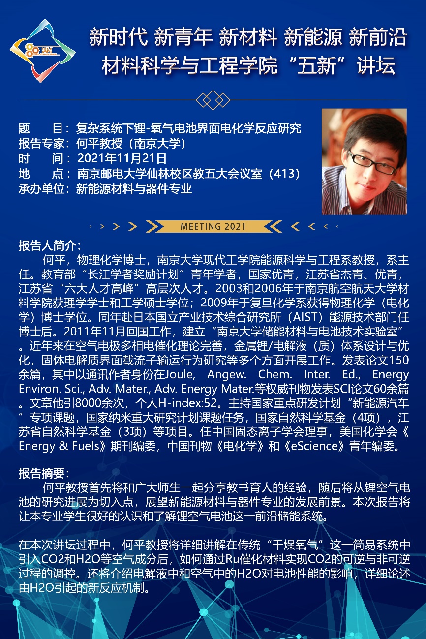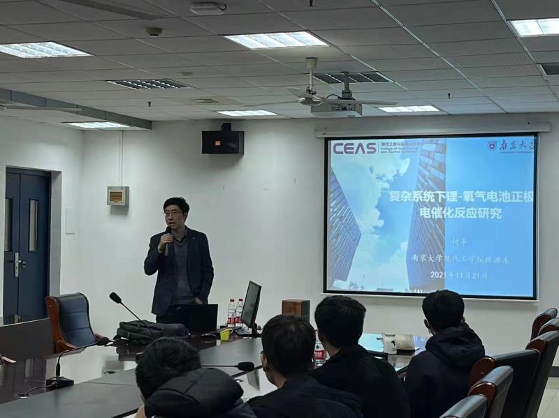 为促进新能源材料与器件本科专业学生的全面发展,增进同学们对本专业的认知和认同感,拓展本专业学生的国际视野,培养本专业学生的创新思维和创新能力,推进专业创新创业教育与专业教育的深度融合,实现为国家培养满足社会需求、掌握最新前沿技术和创新能力的新时代新能源材料高端人才的最终目标。2021年11月21日上午10:00,新能源材料与器件专业在学校教五413会议室成功举办了首期主旨为“新时代、新青年、新材料、新能源、新前沿”的“五新”讲坛专家报告会。此次讲坛的专家为南京大学现代工程学院新能源科学与技术专业系主任、国家优秀青年基金获得者何平教授。报告由新能源材料与器件专业系主任黄镇东副教授主持,新能源材料与器件专业的全体本科生和班主任闫伟博老师参加了本次报告会。