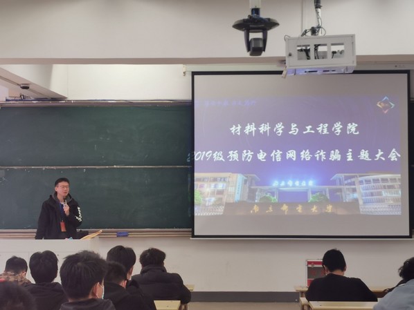 为提高学生的安全防范意识,增强自我保护能力,进一步维护自身的合法权益,2021年12月3日下午,在教4-201教室开展了以“预防电信网络诈骗”为主题的教育大会,本次大会由2019级辅导员王森主持,2019级全体学生参加大会。