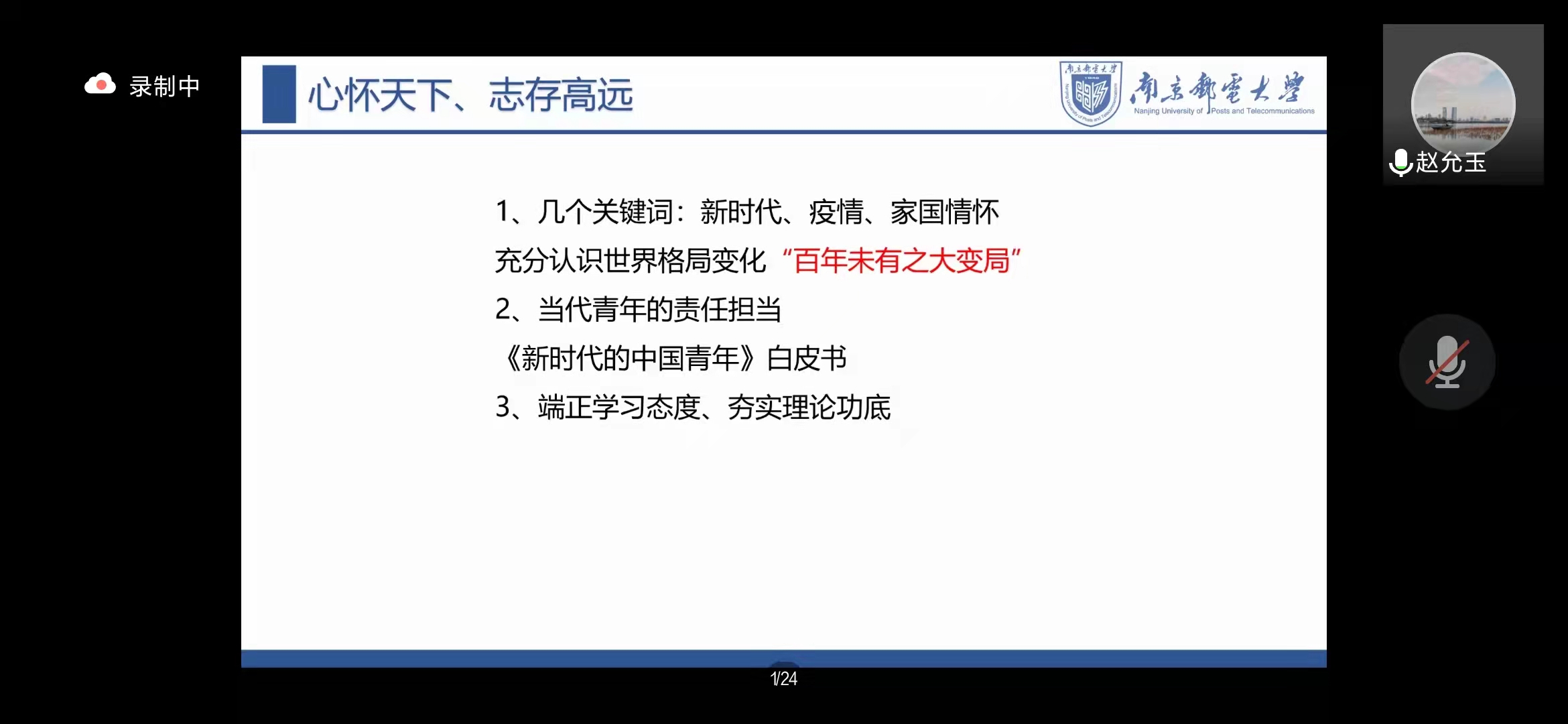 典礼在雄壮的国歌声中拉开帷幕。赵书记给积极分子学员做开班动员讲话。赵书记围绕新时代、疫情、家国情怀三个关键词展开讲解。赵允玉书记希望青年学生能够在新的时代背景之下胸怀世界、展现担当,在“百年未有之大变局”时代背景之下正确看待封校的防疫措施,配合管理,认识世界形势,做好自己,带动他人,起到先锋模范作用。赵书记还重点介绍94岁离休老教师尹先为在南邮80周年校庆日向学校捐赠的感人事迹,号召学员学习尹先为老师作为老共产党员大爱无疆的朴素精神。最后,赵书记要求大家认认真真学习培训班规定的理论课程,夯实理论功底,能够顺利通过党校培训。