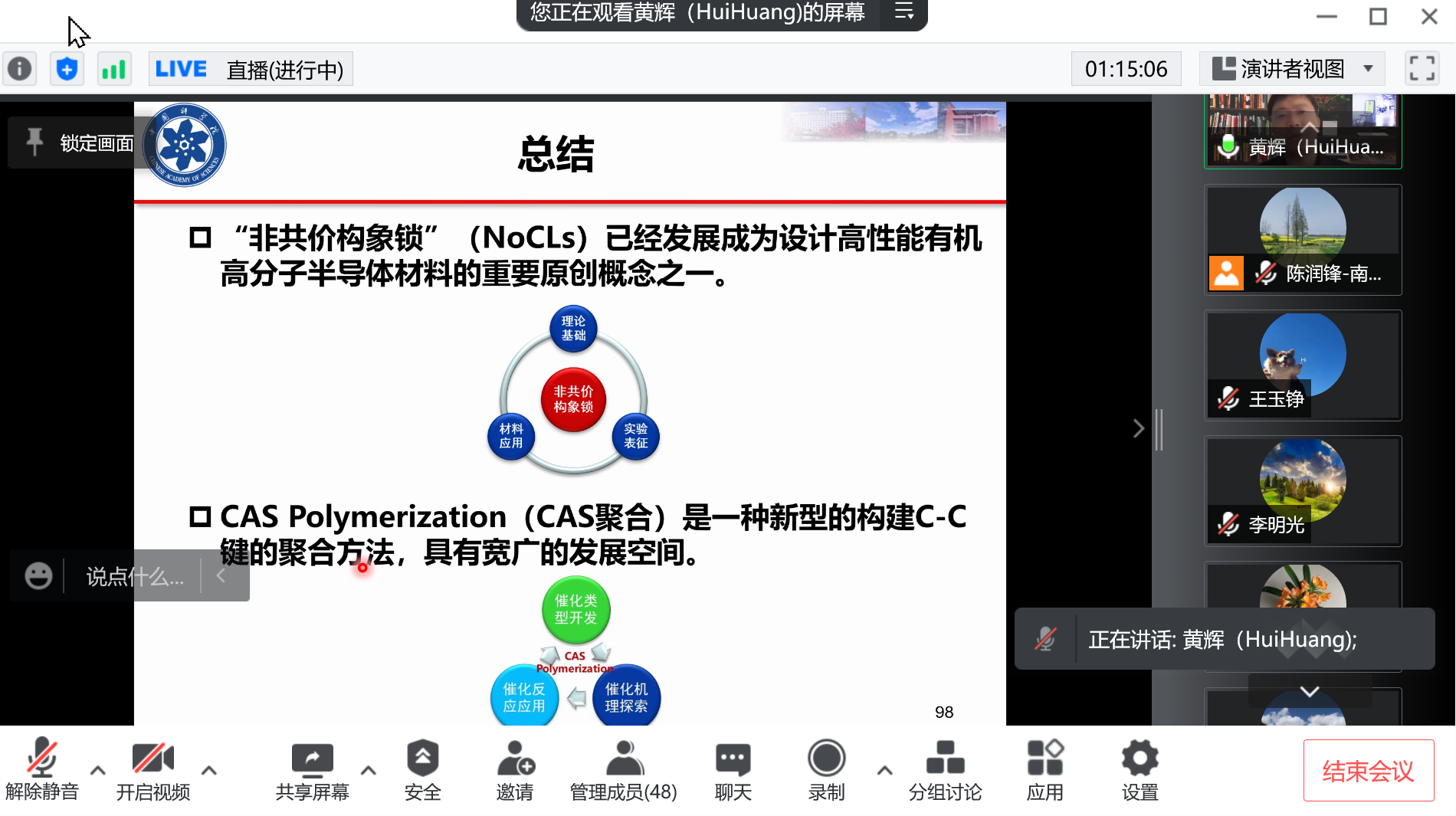 承国脉,薪火相传八十载;创未来,弘毅笃行谱新篇。值此南邮八十华诞校庆学术活动月之际,应91吃瓜 陈润锋教授邀请,中国科学院大学黄辉教授于2022年4月29日下午2点在腾讯会议和腾讯直播上以“有机高分子半导体材料的设计与合成”为题作了一场精彩报告。91吃瓜 副院长陈润锋主持了报告,共有50余名师生参加了线上学习。