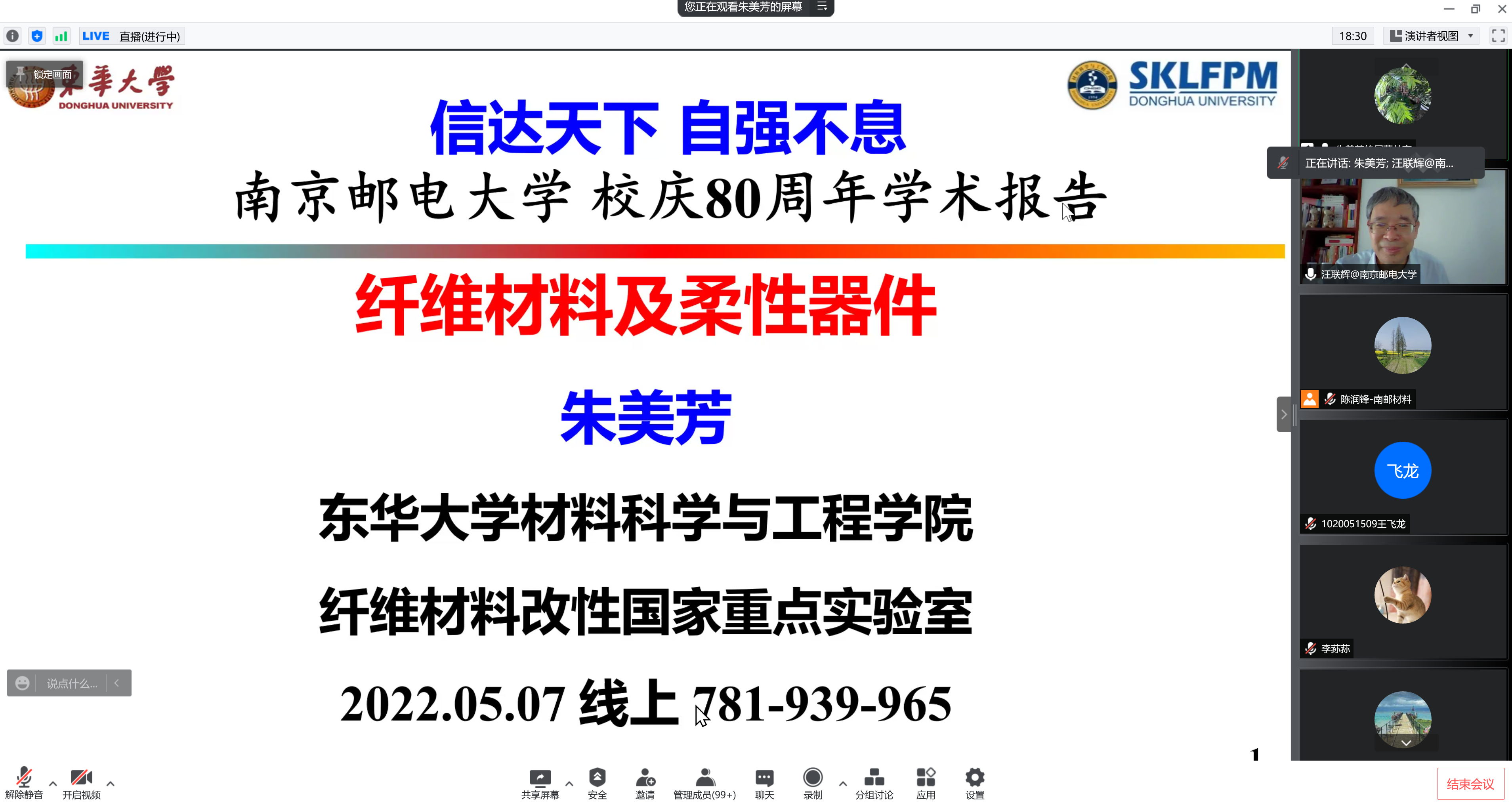 承国脉,薪火相传八十载;创未来,弘毅笃行谱新篇。值此南邮八十华诞校庆学术活动月之际,应汪联辉教授邀请,东华大学朱美芳院士于2022年5月7日上午14点半在腾讯会议和腾讯直播上为师生作了以“纤维材料及柔性器件”为主题的学术报告。汪联辉教授主持了报告,线上共有近200名师生参加了学习交流。