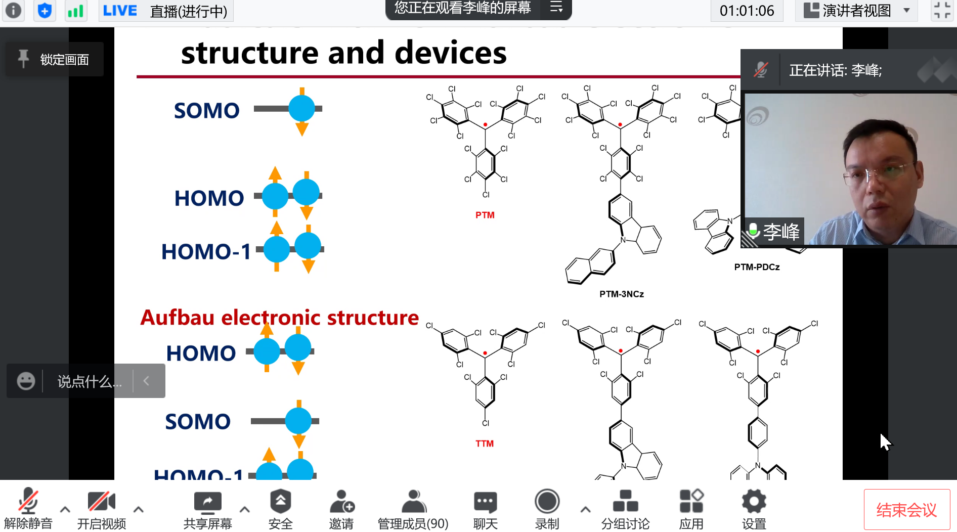 报告中,李峰教授向大家介绍了他们课题组在有机电中性自由基材料及其电致发光器件(OLED)上的研究进展与成果。传统的有机电致发光材料都是闭壳分子,即最外层分子轨道被两个电子填满。李峰教授团队把有机电致发光材料扩展到了开壳分子,即最外层分子轨道被一个未成对的电子占据。与闭壳分子相比,开壳分子的基态和激发态都是双线态,基态与激发态之间的跃迁没有自旋禁阻的问题。李峰教授着重讲述了他们课题组以电中性三苯基甲基自由基为核,外围通过连接不同电子给体,设计合成D-A类型的自由基发光材料,通过调控电子给体与中心自由基核的共轭程度,以及器件结构优化,获得了高发光效率自由基分子及其发光器件。