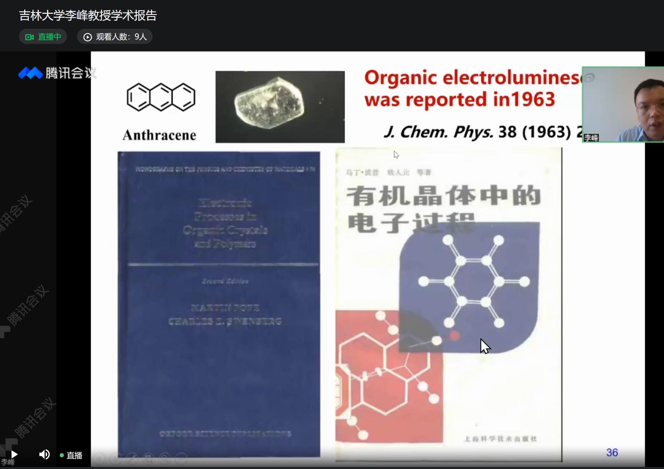 承国脉,薪火相传八十载;创未来,弘毅笃行谱新篇。值此南邮八十华诞校庆学术活动月之际,应91吃瓜 陈润锋教授邀请,吉林大学李峰教授于2022年5月6日下午2点在腾讯会议和腾讯直播上为师生作了以“双线态自由基发光材料与器件”为题的精彩报告。91吃瓜 副院长陈润锋主持了报告,线上共有100余名师生参加。