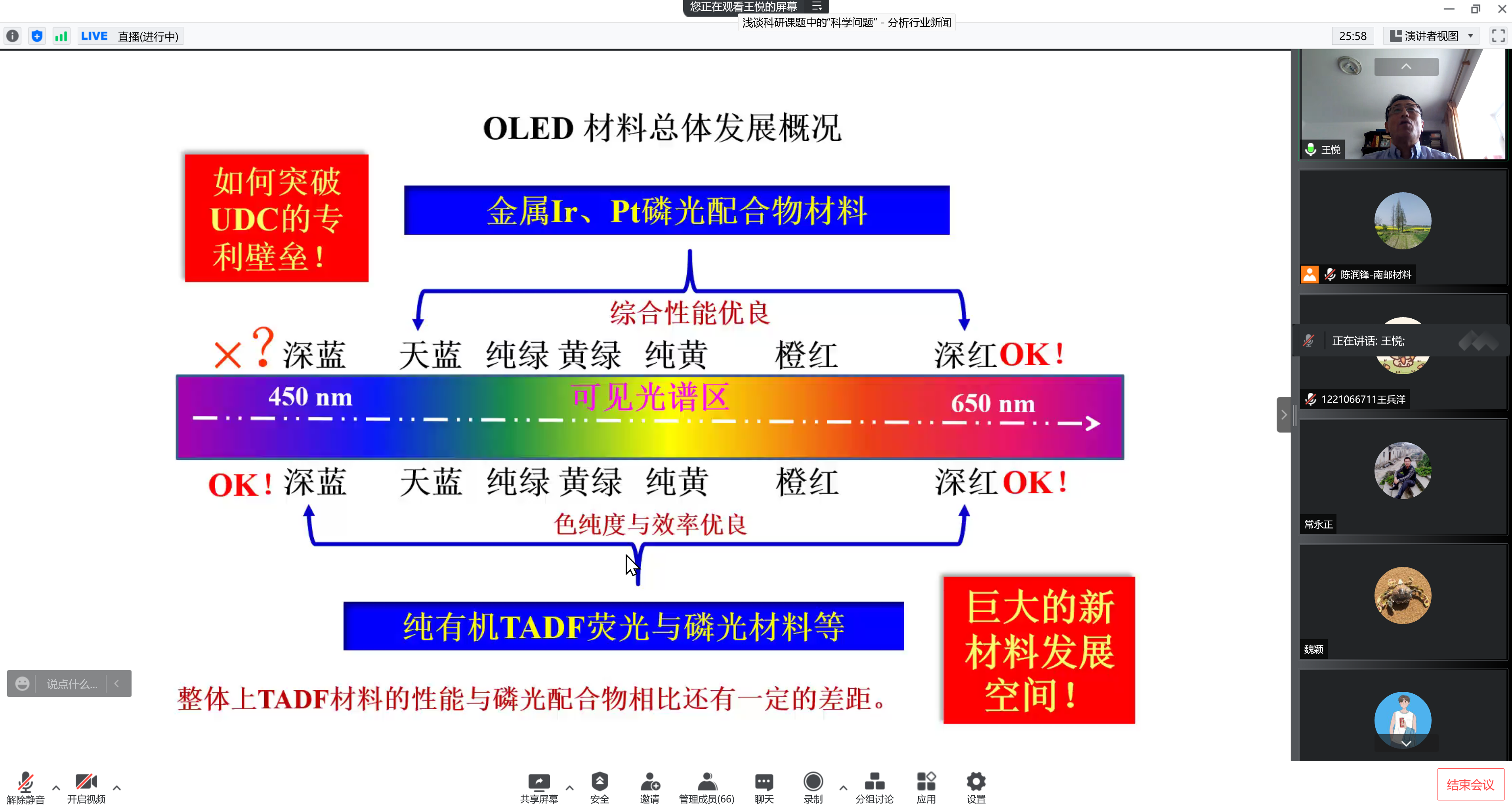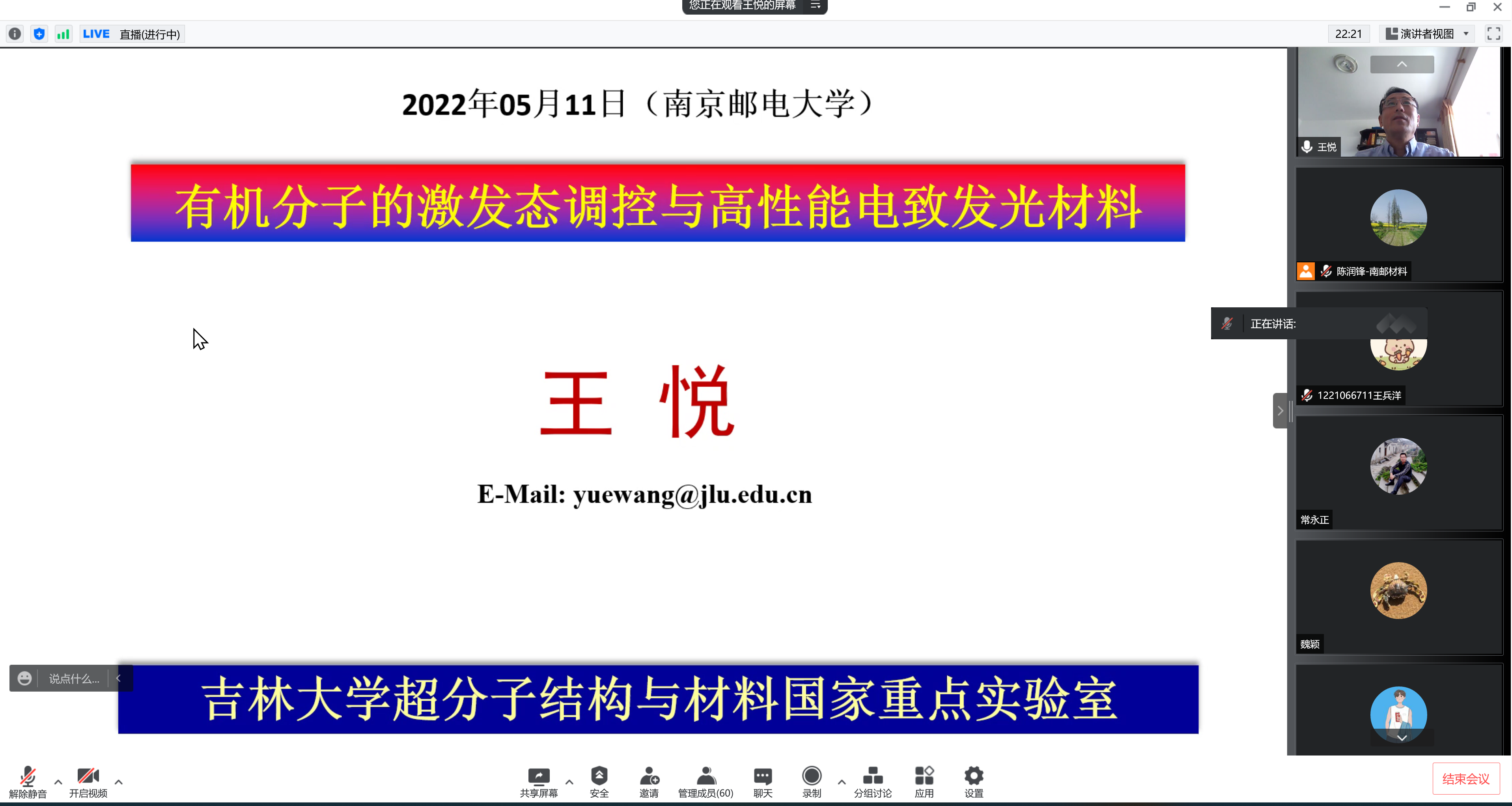 承国脉,薪火相传八十载;创未来,弘毅笃行谱新篇。值此南邮八十华诞校庆学术活动月之际,应91吃瓜 陈润锋教授邀请,吉林大学王悦教授于2022年5月11日下午2点在腾讯会议和腾讯直播上为师生作了以“有机分子的激发态调控与高性能电致发光材料”为主题的学术报告。陈润锋教授主持了报告,线上共有近100名师生参加。