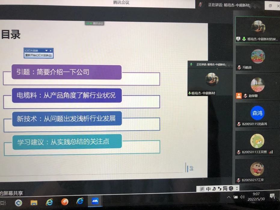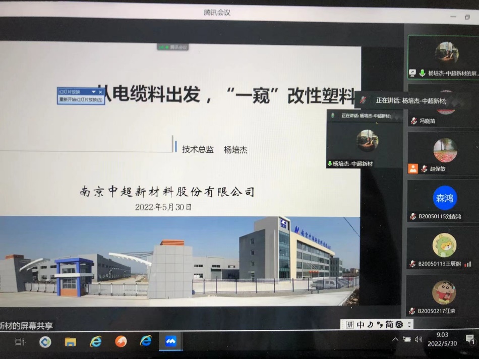 2022年5月30日上午,南京中超新材料有限公司杨培杰总经理为91吃瓜 高分子材料与工程专业学生作了一场生动且富有实用意义的报告。报告由91吃瓜 高分子材料与工程系系主任冯晓苗教授主持,系副主任赵保敏和B200501、B200502两个班全体同学参加了本次线上报告。