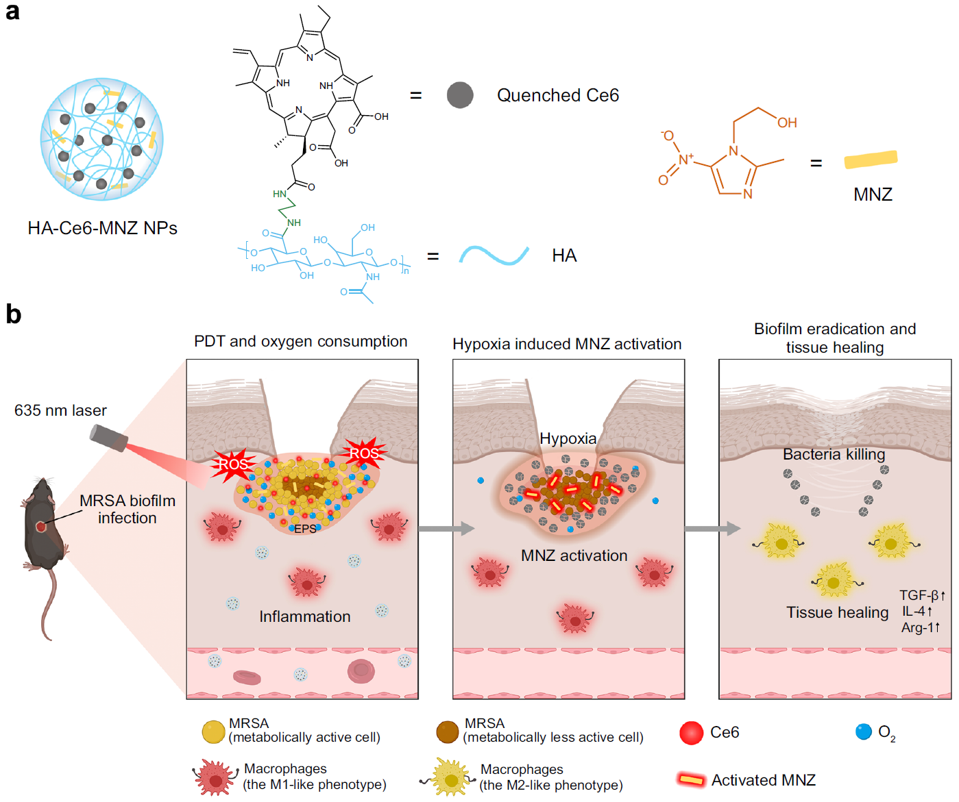 针对以上问题,汪联辉教授和宇文力辉副教授团队构建了一种由透明质酸、光敏剂二氢卟吩(Ce6)和甲硝唑(MNZ)组成的纳米试剂(HCM),用于耐甲氧西林金黄色葡萄球菌(MRSA)生物膜感染的治疗。HCM能够在生物膜微环境中酶的作用下降解,释放Ce6和MNZ。在光照下,Ce6能够将氧气转化为活性氧,杀死生物膜表层的活性菌,并加剧生物膜的乏氧状态,诱导MRSA产生硝基还原酶,将MNZ转化为杀菌活性的咪唑片段,从而高效清除生物膜内部细菌,并抑制生物膜的再生长。以上治疗模式还可诱导巨噬细胞向M2型极化,促进伤口组织的愈合。本研究提出通过光动力治疗激活药物抗菌活性的微环境调控策略,为细菌生物膜感染高效治疗提供了新的思路。