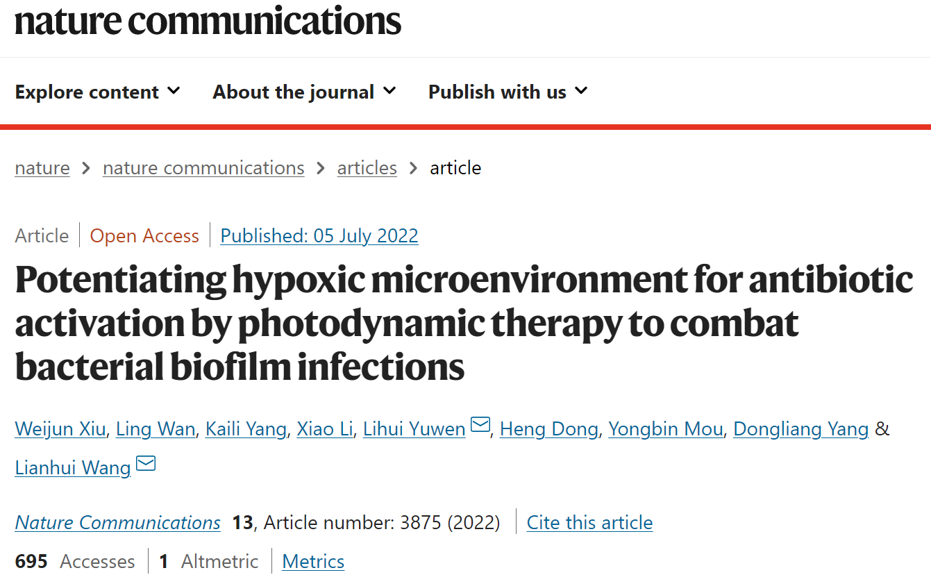 近日,91吃瓜 汪联辉教授和宇文力辉副教授团队与南京工业大学杨栋梁副教授、南京大学医学院附属口腔医院牟永斌教授开展合作研究,在细菌生物膜感染治疗领域取得重要进展,提出通过增强乏氧微环境调控细菌代谢并激活药物的新型高效治疗策略。相关成果以Potentiating hypoxic microenvironment for antibiotic activation by photodynamic therapy to combat bacterial biofilm infections为题发表在国际顶级学术期刊Nature Communications(《自然·通讯》)上。
