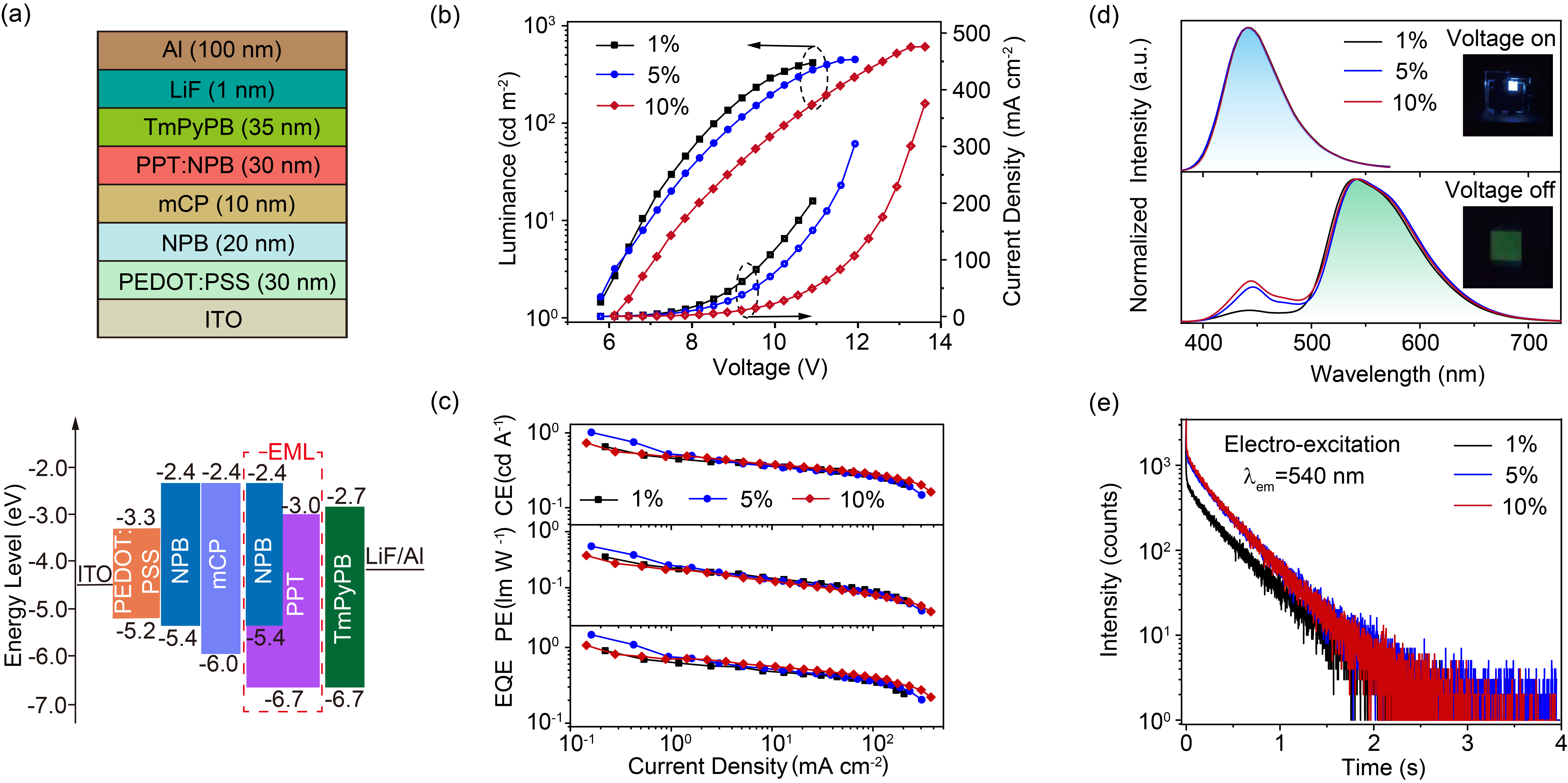 图3:(a)器件结构(上)与能级图(下),(b)电流密度-电压-亮度曲线图,(c)效率-电流密度图,(d)通电时(上)和断电后(下)的电致发光光谱图,插图:(d) OLEDs器件通电(上)和断电(下)状态下的照片。(e)余辉OLEDs的瞬态电致发光衰减曲线。