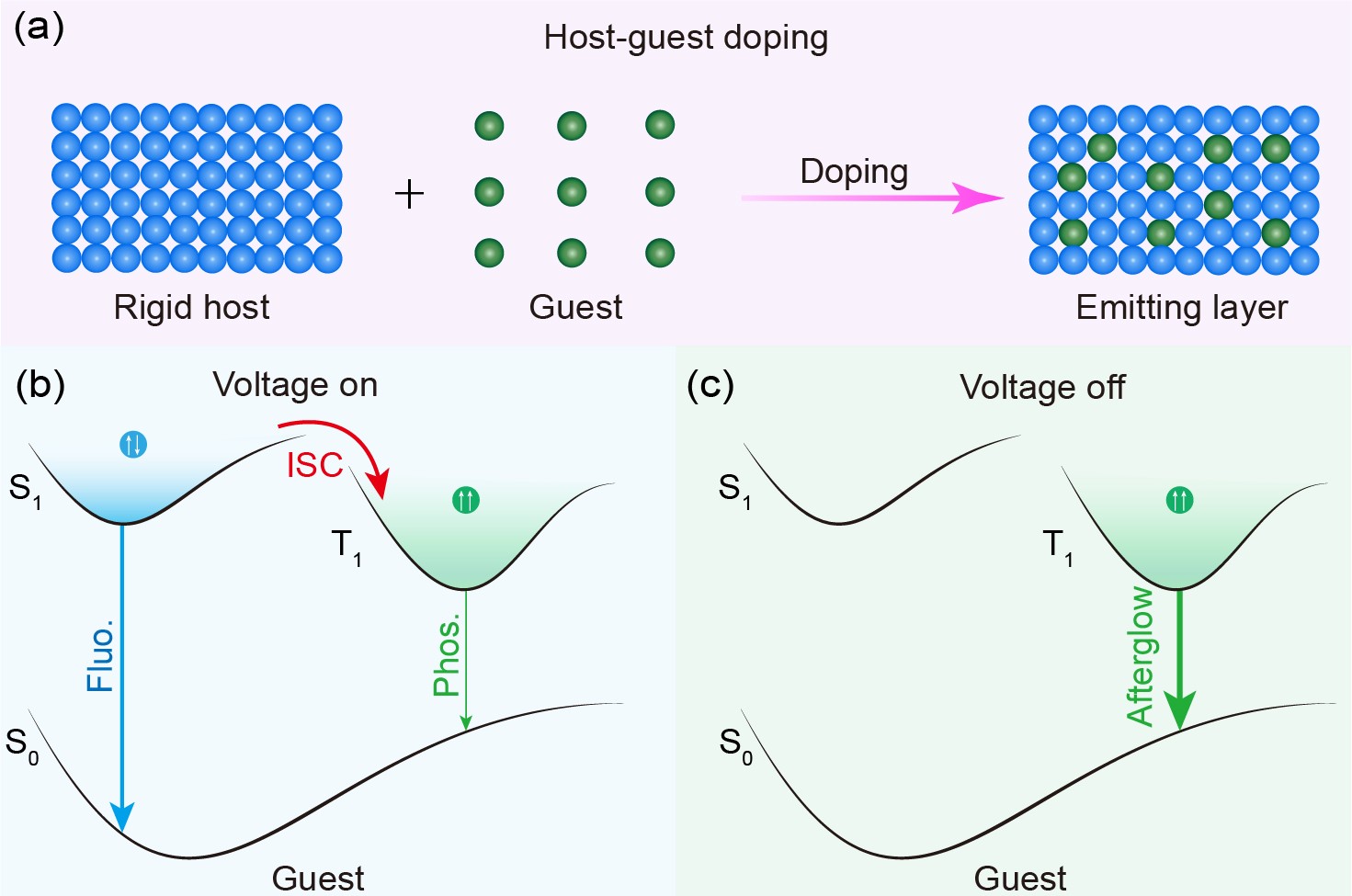 图1: (a) 余辉OLEDs发射层的主客体掺杂策略示意图;(b-c) 余辉OLEDs发光机制的雅布隆斯基图。