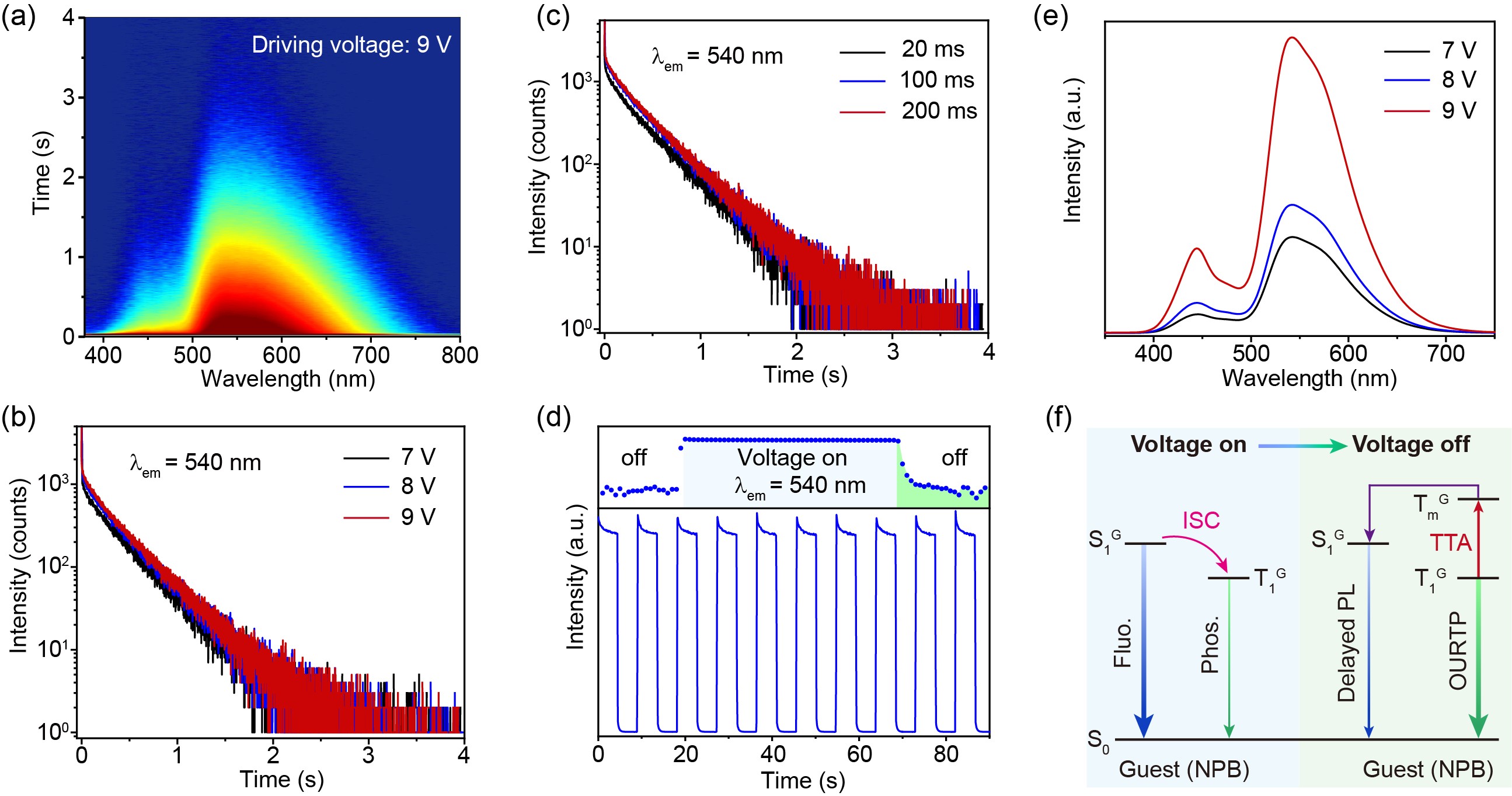 另外,令人兴奋的是,该类余辉OLEDs显示出优异的长余辉发射稳定性,在超过10个开关周期后,其发光强度和余辉寿命几乎保持不变(图4),这归因于发光层掺杂薄膜固有的稳定余辉性能和器件平衡的载流子传输。此外,作者还分析了此类余辉OLEDs的发光过程:在外加电压下,由于客体单线态激子的荧光强度远远大于其三线态激子的磷光,所以在这个过程中只能观察到客体蓝色荧光发射,当外加电压关闭时,由于客体单线态激子的寿命短,荧光发射瞬间消失;同时,寿命超过300 ms的三线态激子则衰减缓慢,产生肉眼可见的绿色余辉。