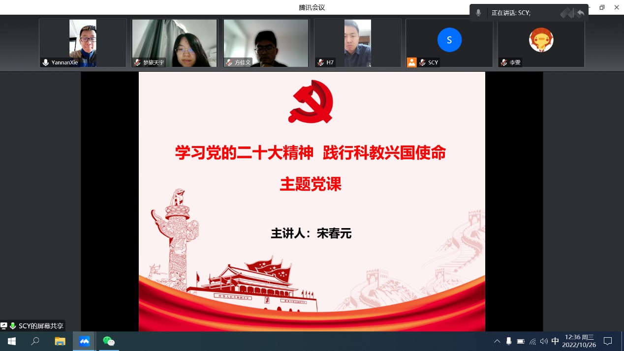 为深入学习贯彻中国共产党第二十次全国代表大会精神,2022年10月26日,材料物理系党支部召开线上会议,开展“学习党的二十大精神,践行科教兴国使命”主题党课学习活动,支部全体党员参加学习。