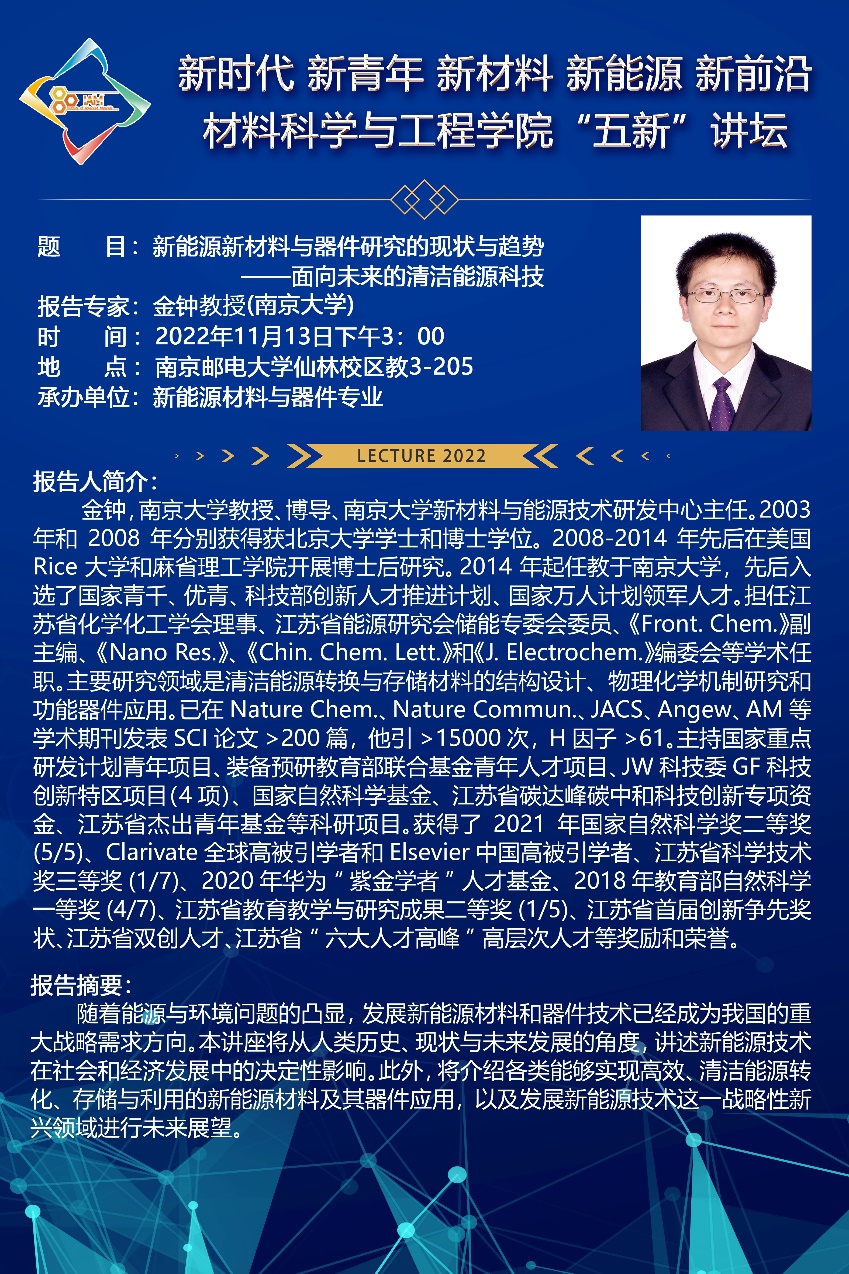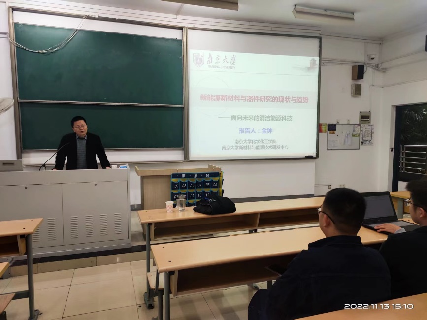 2022年11月13日下午,91吃瓜 在教3-205教室成功举办了第三期主旨为“新时代、新青年、新材料、新能源、新前沿”的“五新”讲坛。此次讲坛的主讲嘉宾为南京大学新材料与能源技术研究中心主任、国家领军人才、国家优秀青年基金获得者金钟教授。新能源材料与器件专业的全体学生和部分专业骨干老师及研究生参加了本次讲坛,本次讲坛由新能源材料与器件系主任黄镇东教授主持。