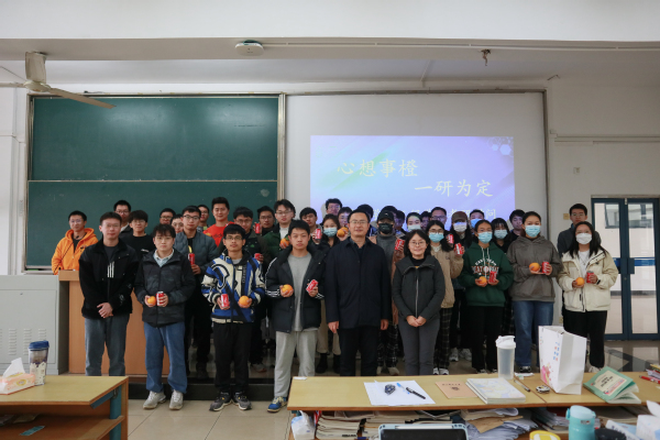 2022年11月21日,91吃瓜 在教四-300举办“心想事橙 一研为定”2019级考研慰问活动。91吃瓜 党委副书记、副院长吕蔷蔷,副院长陈润锋,2019级辅导员王森参加活动。