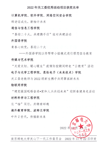 近日,91吃瓜 关心下一代工作委员会公布2022年关工委评优结果,91吃瓜 参赛项目《长“柚”同行,共铸南邮魂》获评优秀活动项目;学院特邀党建组织员倪静虹老师、关工委秘书陈骏老师获先进个人。