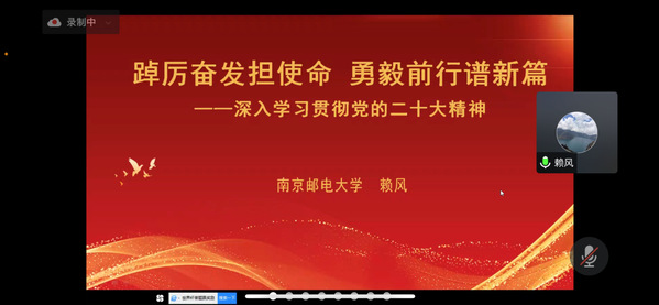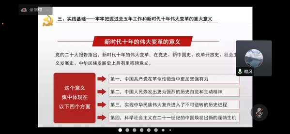 赖老师从党的二十大的主题、过去五年的工作和新时代十年的伟大变革、马克思主义中国化时代化、新时代中国共产党的使命任务、文化自信自强、坚持党的全面领导和全面从严治党等方面,对党的二十大精神进行了系统解读和深入阐释。他指出,要深刻理解学习党的二十大精神的重大意义,深刻领悟“两个确立”的决定性意义,增强“四个意识”、坚定“四个自信”、做到“两个维护”,用习近平新时代中国特色社会主义思想武装头脑,更加自觉地用党的二十大精神统一思想,紧跟习近平总书记奋进新征程、建功新时代的步伐。