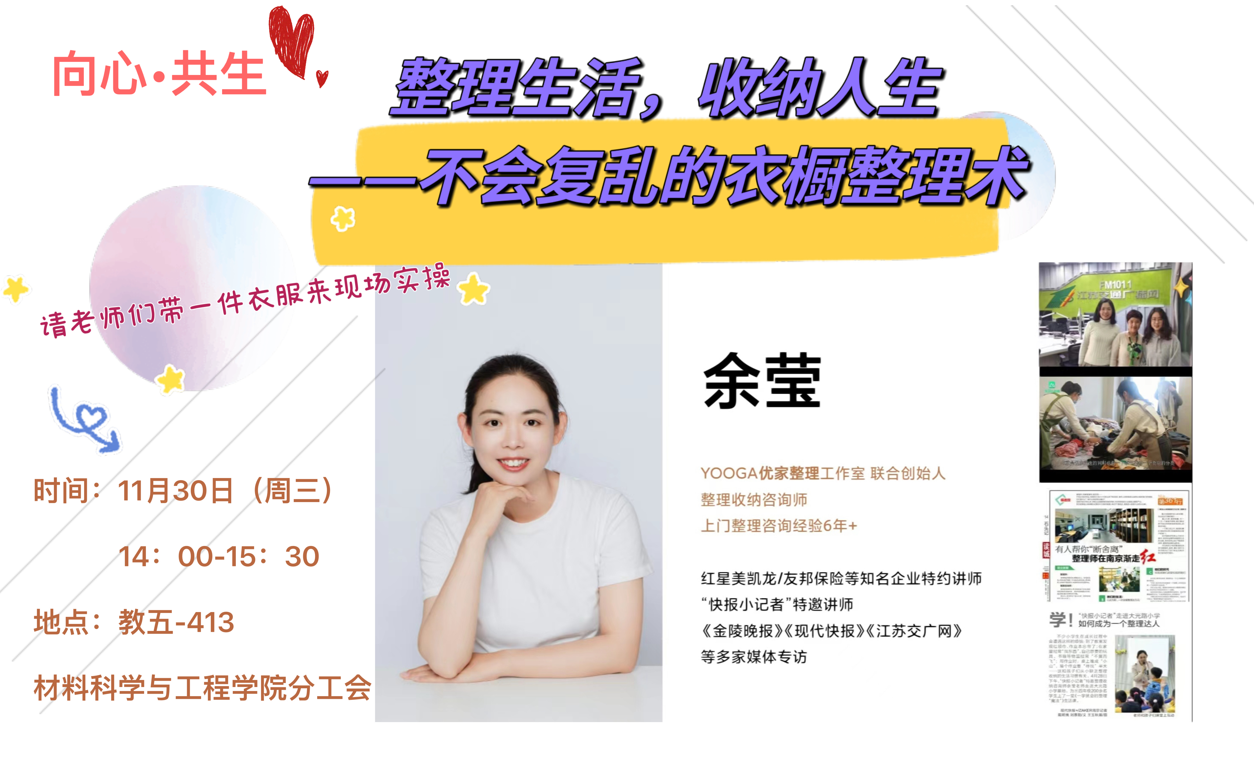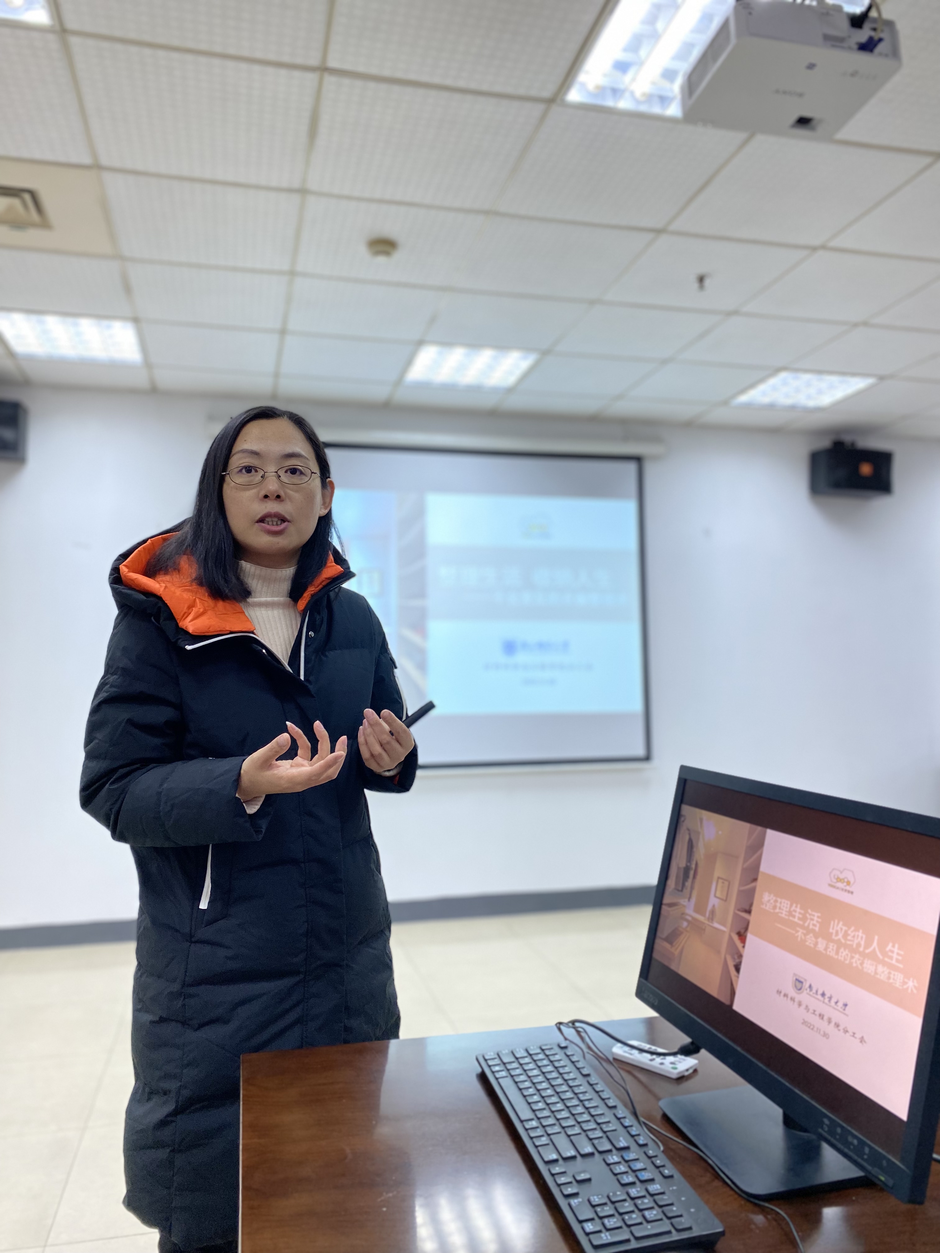 11月30日下午,学院邀请到YOOGA优家整理工作室的联合创始人、整理收纳咨询师余莹做《整理生活,收纳人生——不会复乱的衣橱整理术》讲座,现场为老师们讲解居家环境的收纳哲学,梳理衣橱整理收纳的技巧和方法,带领老师们现场操作练习基本收纳步骤。