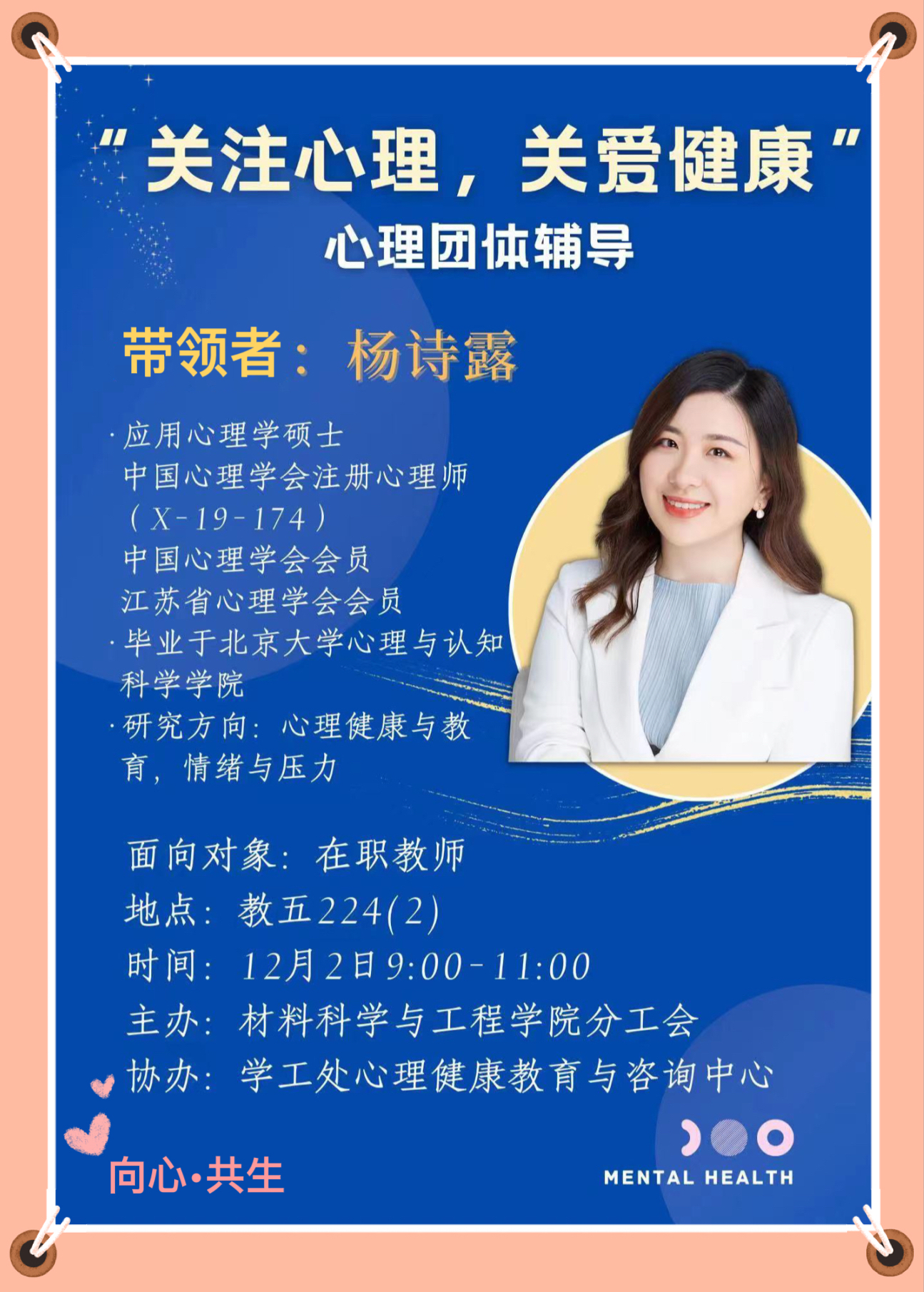 12月2日上午,学院分工会、关工委邀请到学工处心理健康教育与咨询中心杨诗露老师带领青年教师开展“关注心理,关爱健康”为主题的心理团体辅导,通过团体活动,分享交流情绪故事,缓解平日压力,促进了青年教师之间的情感链接。