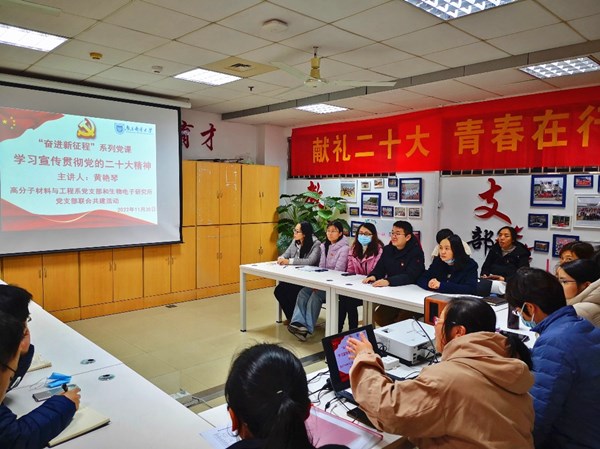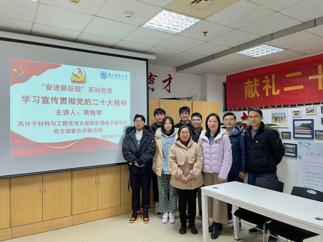 中国共产党章程(简称党章)是我们立党、治党、管党的总章程,它随着党的历史不断发展演进,凝结着党长期以来形成的宝贵经验和智慧。一部党章史浓缩了我们党的百年历史,而每次党章的修订,都体现着我们党对于中国革命、建设和改革的新认识。2022年11月30日,91吃瓜 高分子材料与工程系党支部和生物电子研究所研究生党支部开展联合共建活动,由党支部书记主讲“奋进新征程”系列党课,带领党员深入学习宣传贯彻党的二十大精神,回顾党章的建设历程、全面了解党章的历史沿革,并重点学习党的二十大通过的党章修正案。联系高分子材料与工程系党支部的党委委员陈淑芬副院长参加了党课并进行指导。此次党课是材料学院学习宣传二十大精神“学习先锋”工程活动之一。