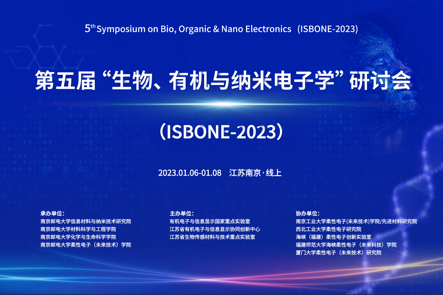 “生物、有机与纳米电子学”研讨会(ISBONE-2023)从全球化战略高度,围绕生物、有机、纳米电子三个领域,立足物理、化学、材料等基础学科的前沿研究,重点聚焦有机电子、纳米技术在信息显示、信息存储、信息传感、信息处理、生物传感、太阳能电池等领域的应用。会议旨在作为桥梁,连接IAM团队与来自海内外的各位专家朋友,从交流成果、探讨合作、高端咨询三个层面,将协同创新、智慧引领推向更高的水平和境界。