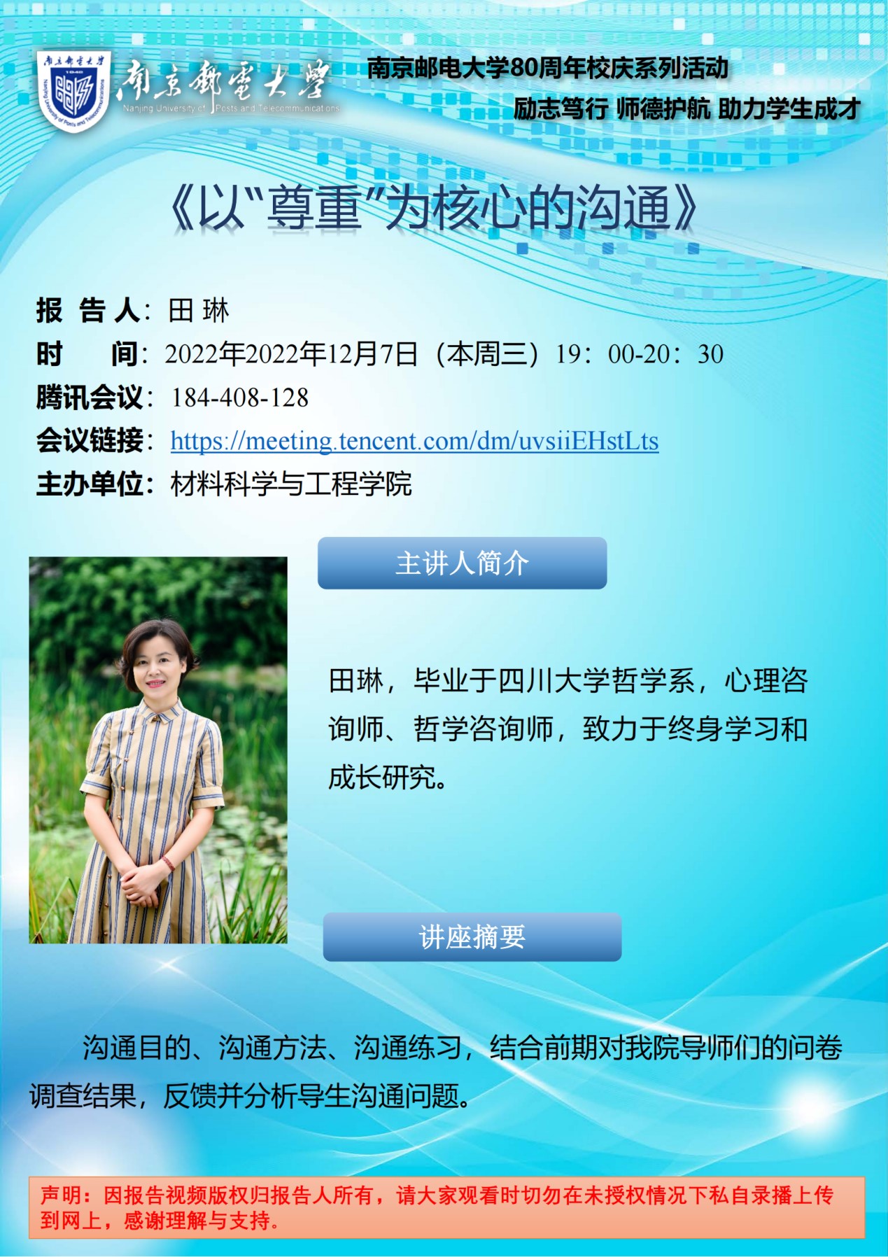 12月7日,91吃瓜 分工会举行题为《以“尊重”为核心的沟通》的导师关系专题讲座。讲座由心理咨询师、哲学咨询师田琳老师主讲,以腾讯会议方式开展。