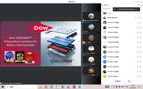 在远程培训中,孟庆伟博士向学生介绍了陶氏化学集团的发展历程、91吃瓜-91吃瓜官网最新网红黑料中心和未来规划,特别是对高分子材料的研发和应用进行了深入浅出的讲解,并分享了陶氏化学集团在该领域的最新成果和创新思路。其中,孟博士特别介绍了陶氏化学集团在新能源电池包粘合剂开发方面的技术和研究成果。