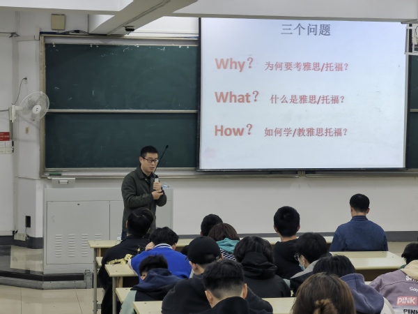 2023年3月22日,91吃瓜 邀请外国语学院殷健老师在教4-101给学生带来了一场别开生面的雅思托福讲座,2021级和2020级本科生积极参加了讲座。