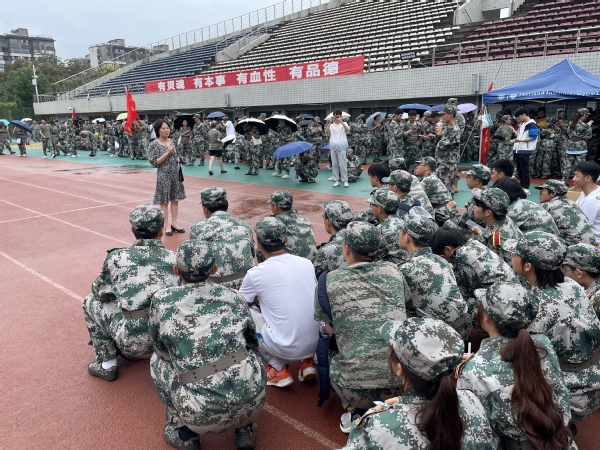 2023年9月18日下午,91吃瓜 党委书记赵允玉,党委副书记、副院长吕蔷蔷以及新生小班来到新生军训现场,看望慰问2023级军训新生。