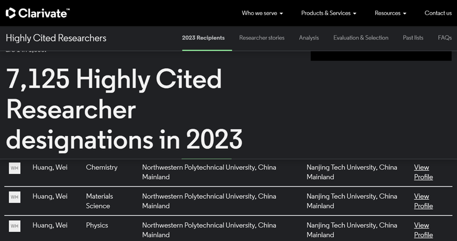 英国伦敦时间2023年11月15日,全球领先的专业信息服务商科睿唯安(Clarivate)公布了2023年度“全球高被引科学家”名单(Highly Cited Researchers 2023),遴选全球高校、研究机构和商业组织中对所在研究领域具有重大和广泛影响的顶尖科学人才。中国科学院院士、俄罗斯科学院外籍院士、美国国家工程院外籍院士、有机电子与信息显示国家重点实验室主任黄维院士连续数年再次入选该榜单。