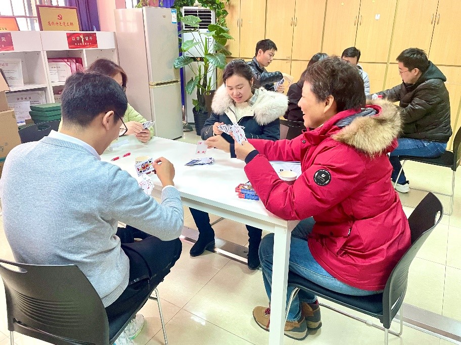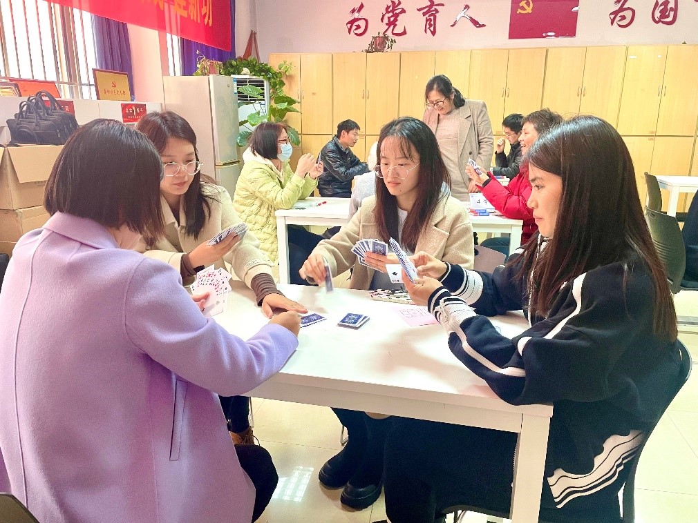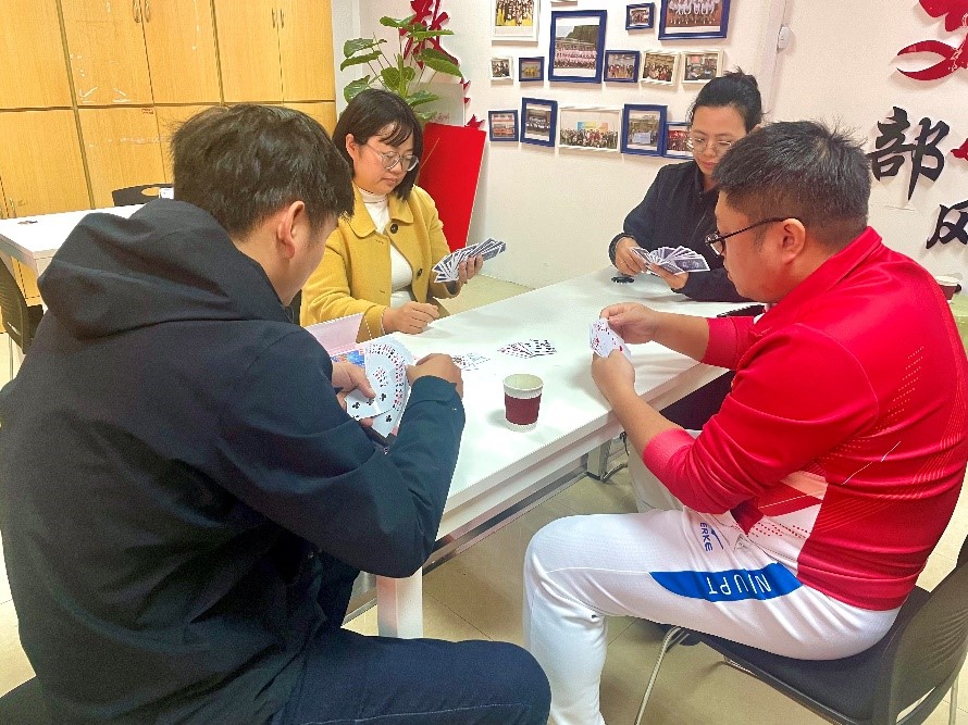 此次掼蛋比赛所有参赛人员进行随机抽签组队。每场比赛50分钟,根据比分差别双方各自积分,五轮比赛结束,按总积分排序。活动现场气氛十分活跃,参赛老师们密切配合、沉着应战,现场时而紧张肃静,时而传来欢声笑语,参赛老师度过了一个轻松愉快的中午。